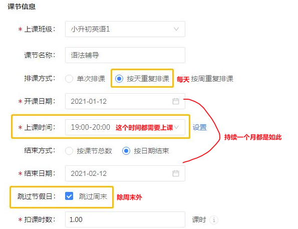 下图添加排课填写信息详见下方说明