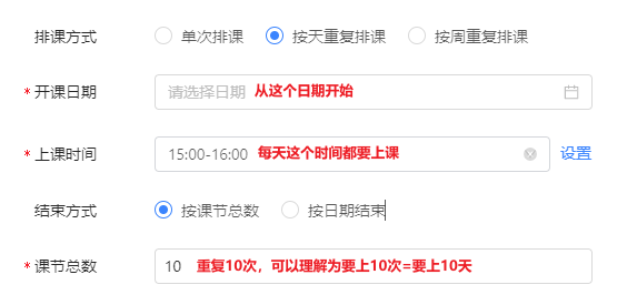 ② 按天重复排课:按当前的排课设定每天重复课程,适合每天都重复相同课节的课程。