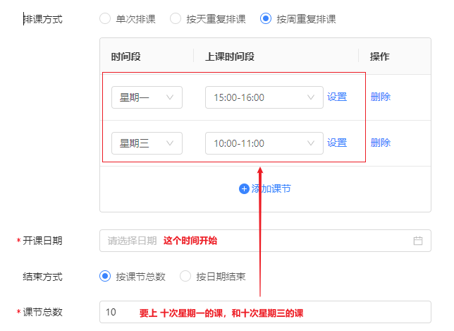 ② 按日期结束:排课方式里的时间重复到这个日期就结束了