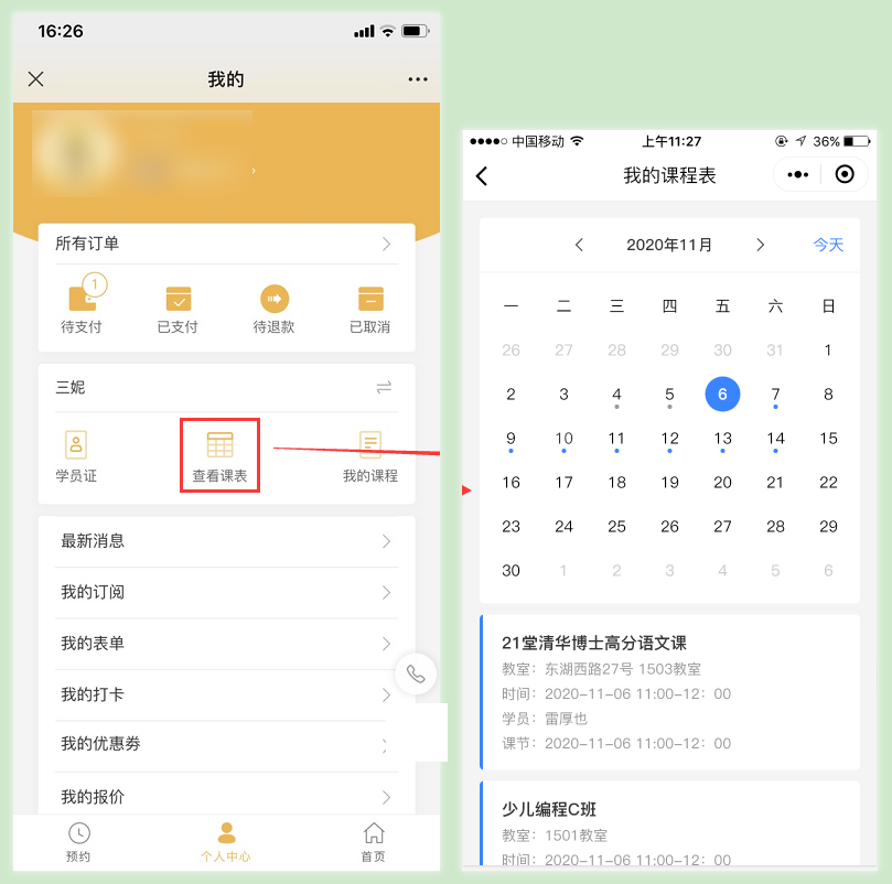 注意:学员在个人中心查看课表的前提是该学员绑定了账号。