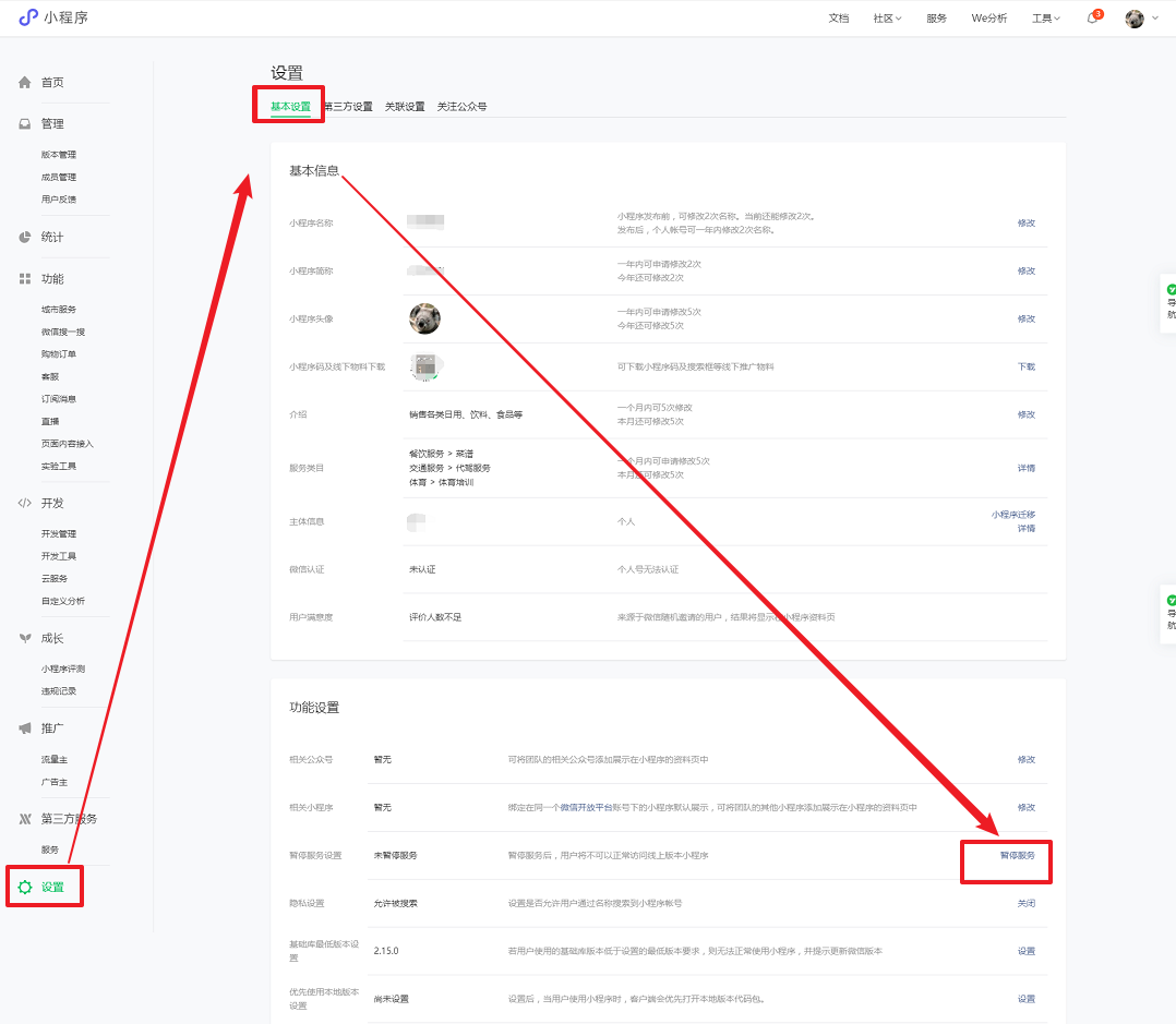 查看微信小程序是否设置了暂停服务。