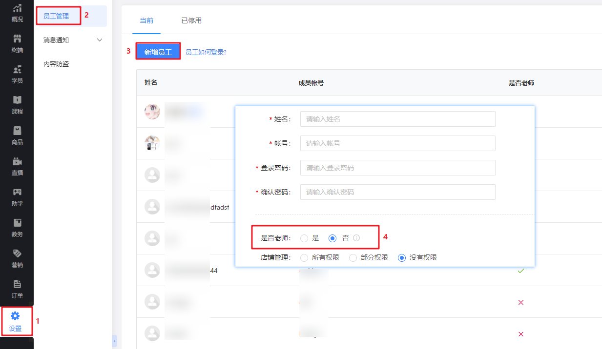 在教育管理后台点击【设置-成员管理-新增员工】,在新增员工页面可以选择是否老师。