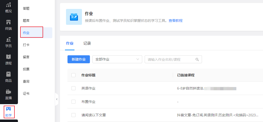 在教育管理后台点击【助学-作业】 ,将作业功能开启。