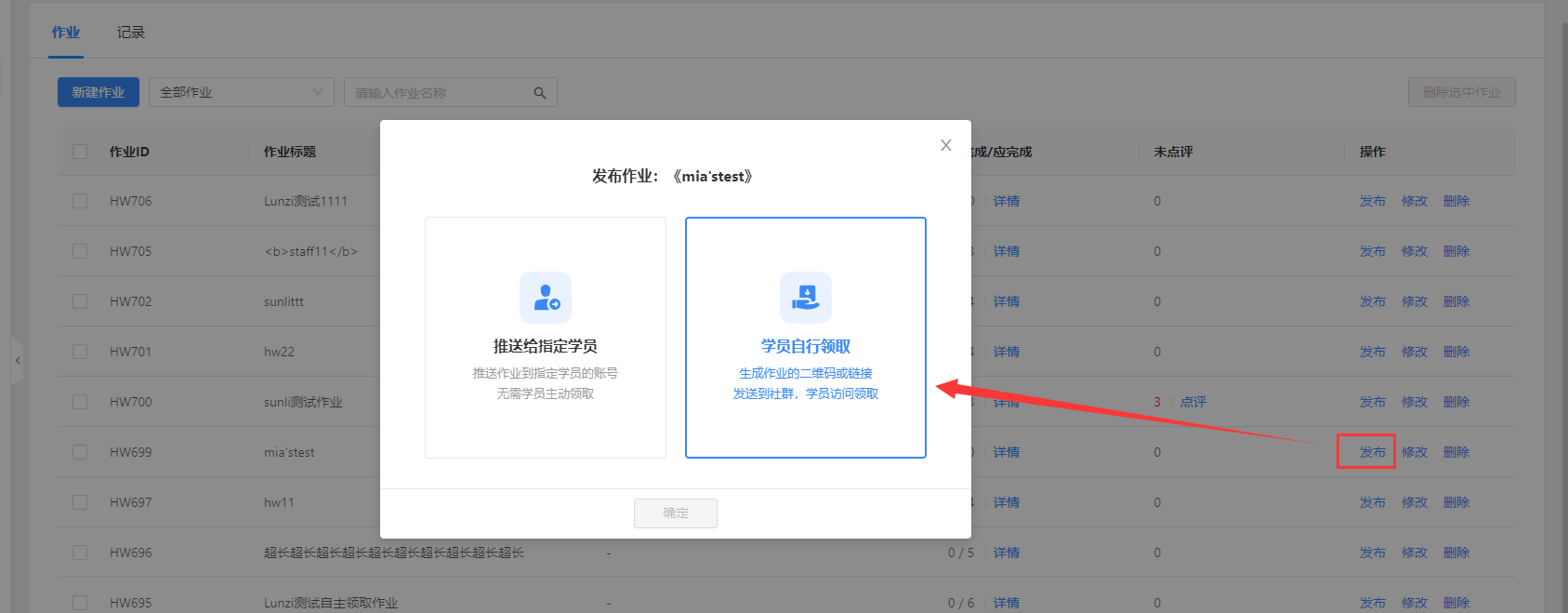 发布后支持推送给指定学员或让学员扫码自行领取作业