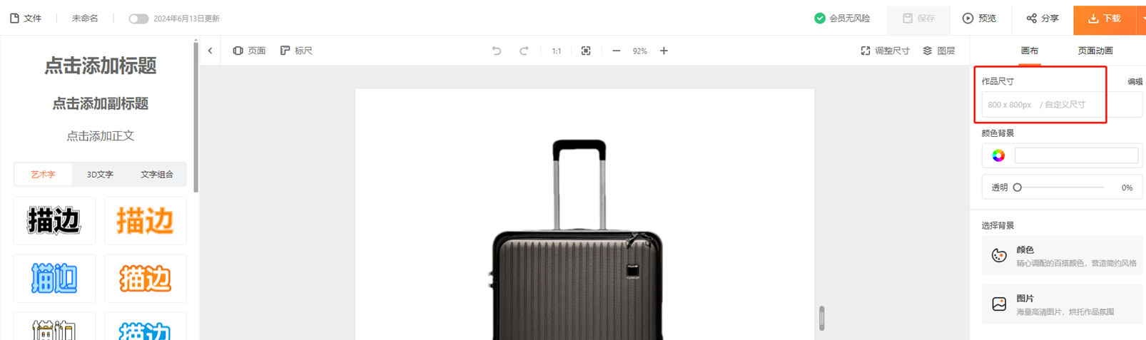 A:下载的是图片格式的话只能保证1:1是清晰的,放大一定会模糊,建议编辑时选择更大的尺寸下载