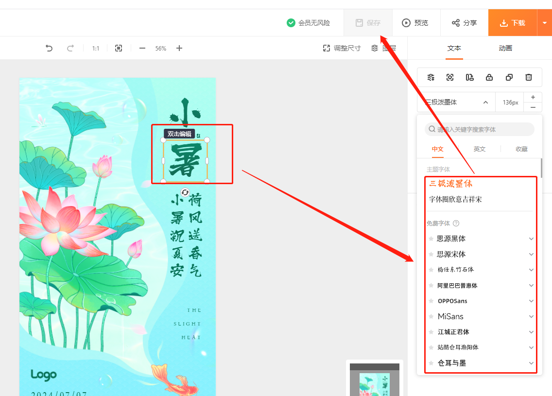 A:选中对应文本框,右侧切换一下字体样式,然后点击保存,再切换回自己想要的字体样式再保存下载