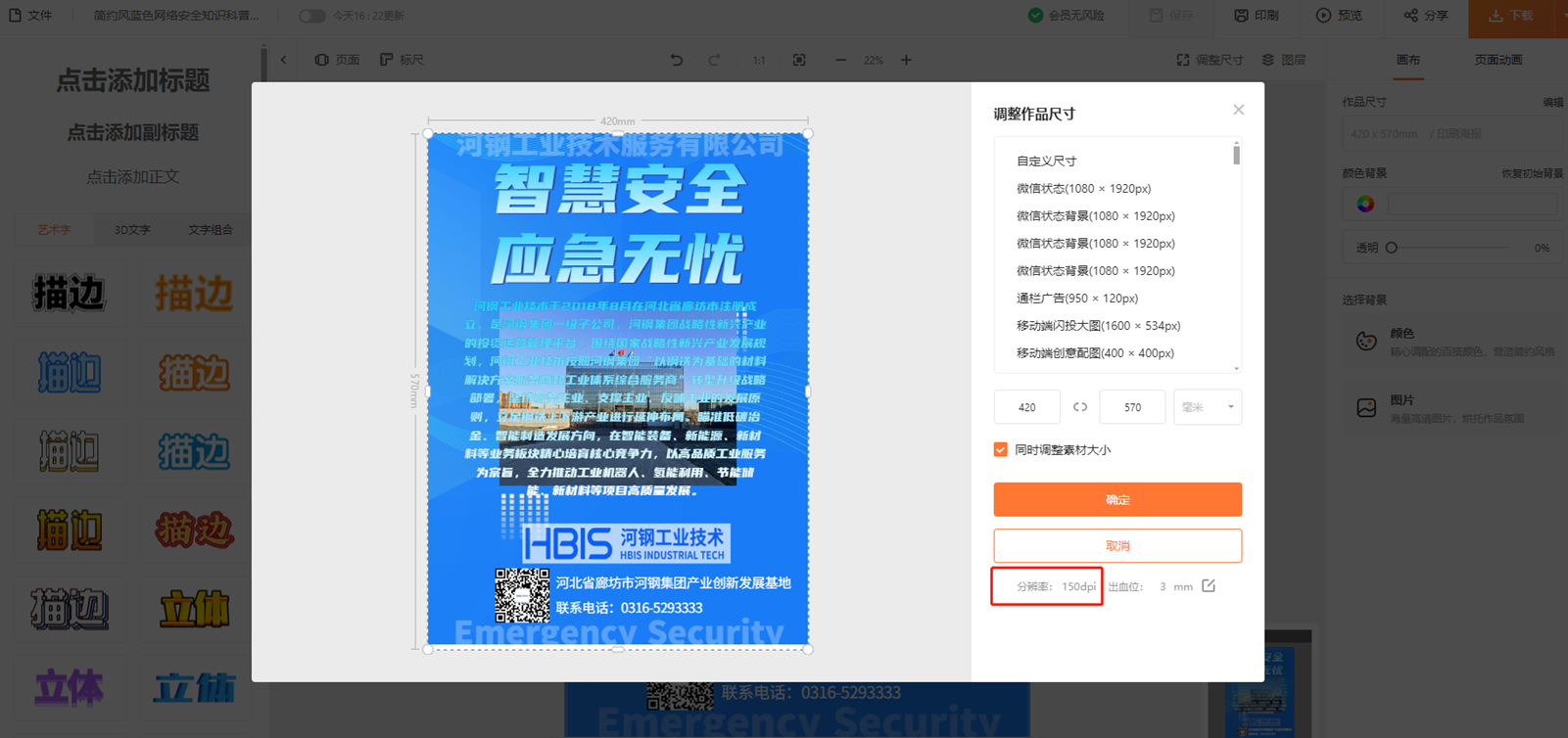 A:海报作品由于dpi问题,可以将dpi修改为120-150的范围,再下载