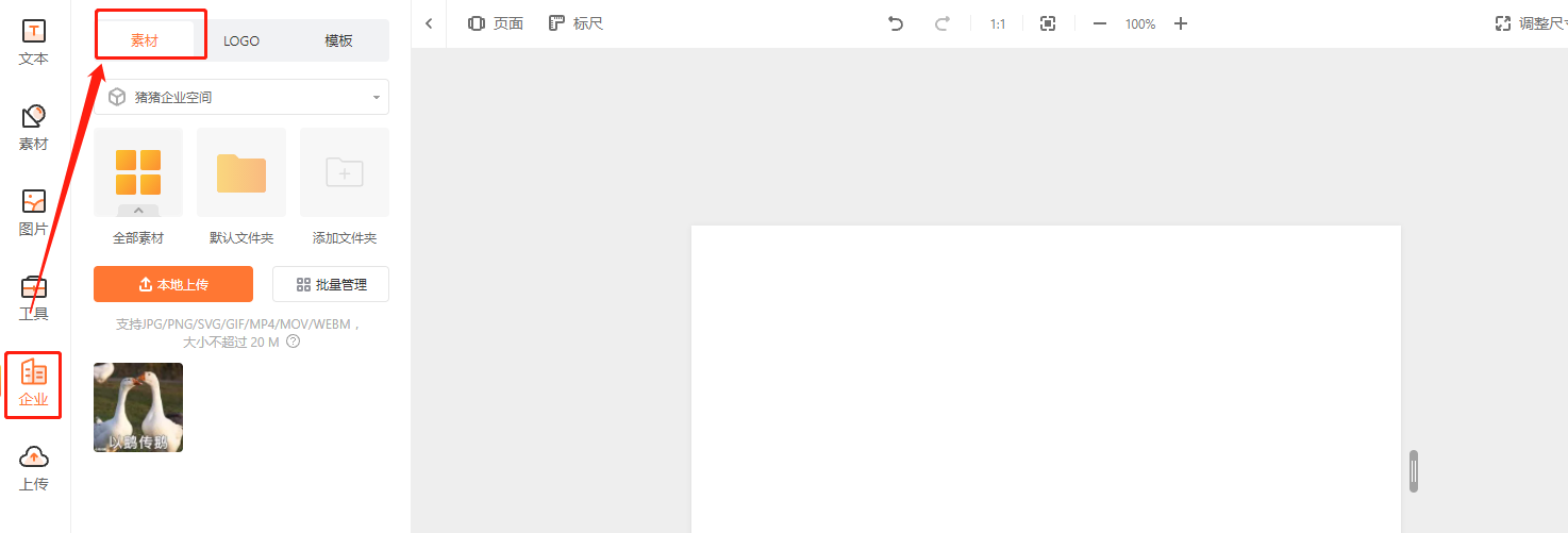 注:仅超级管理员/管理员能在企业空间上传素材,提供给企业内成员共用