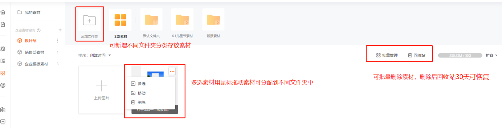 可在企业空间内新增,移动,删除对应素材到不同文件夹中进行管理