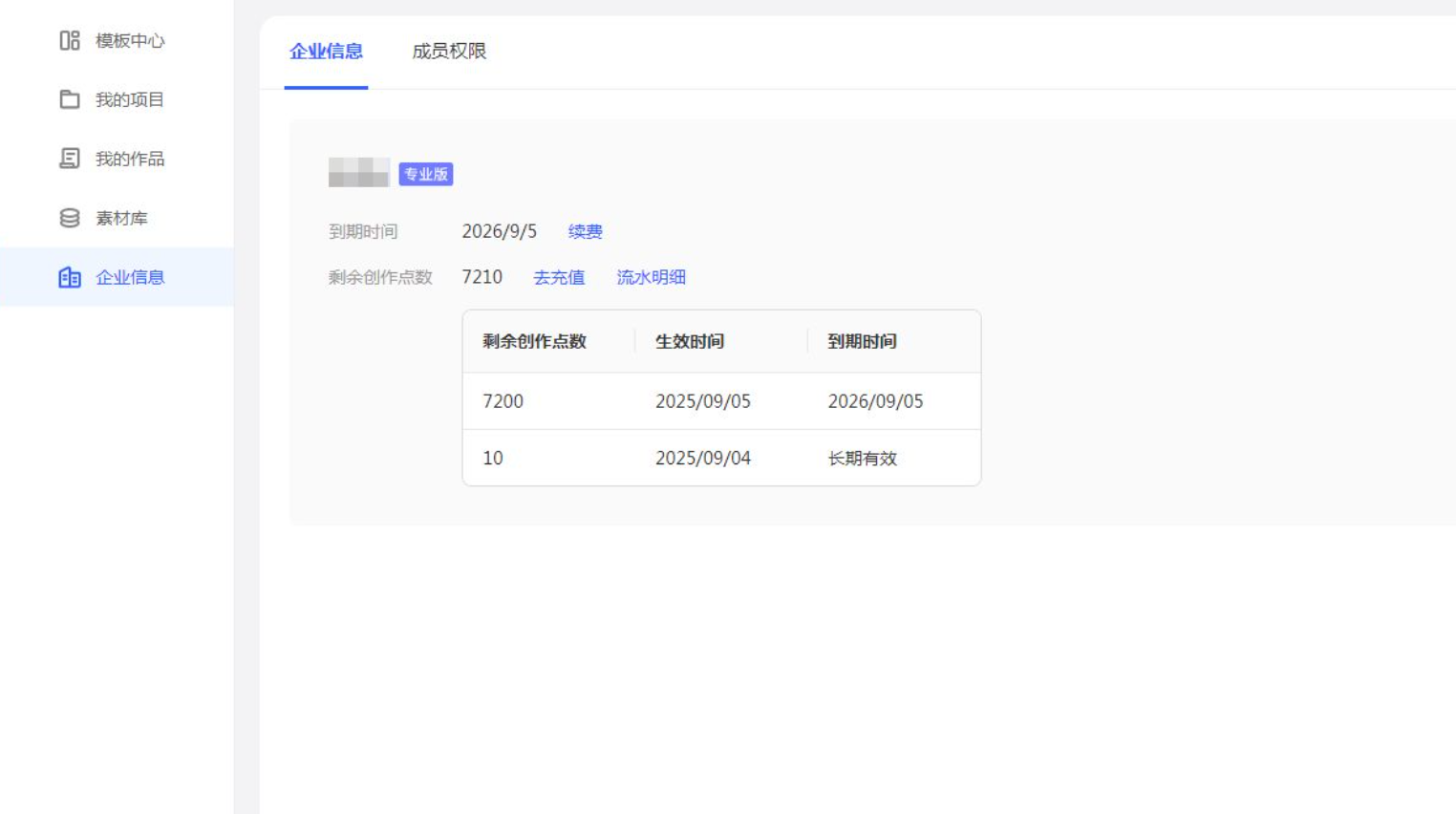 - 在默认的“企业信息”标签页,您可以查看当前套餐、到期时间、剩余点数及点数包的有效期。