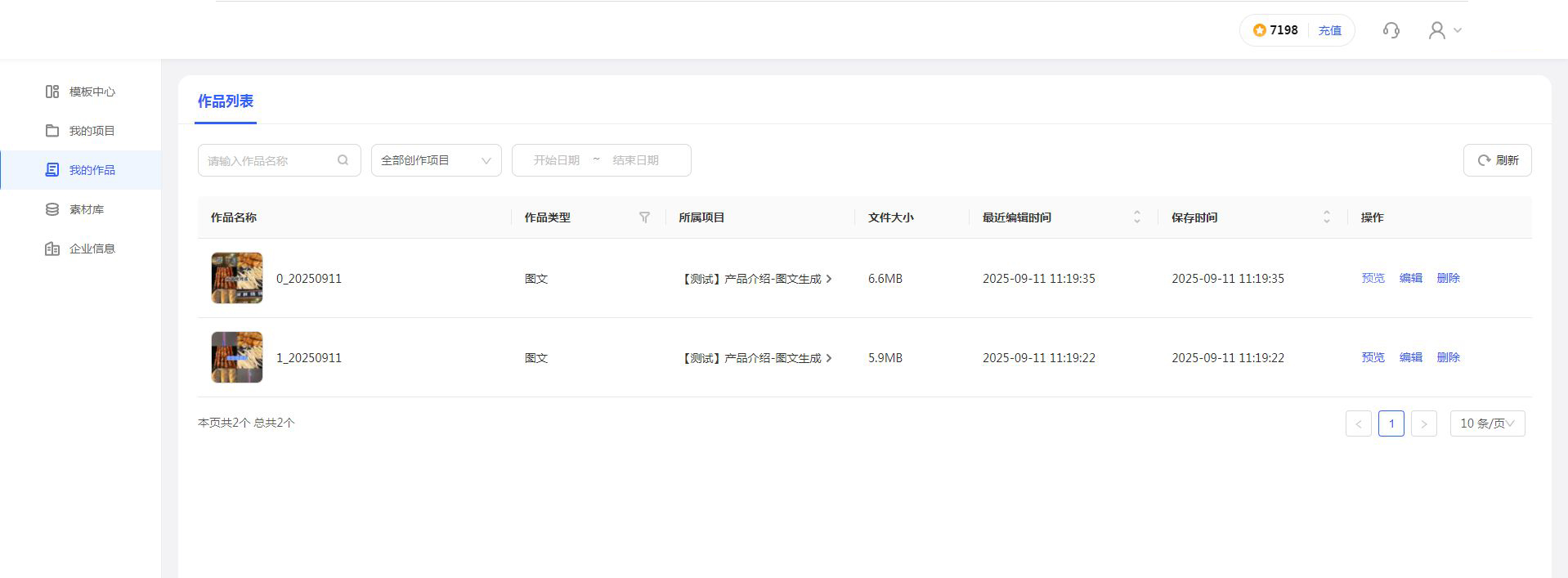 在每行作品的末尾“操作”列下,按需使用【预览】、【编辑】、【删除】按钮,方便您对单个作品进行管理。