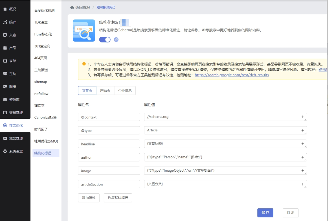 在网站管理后台 【搜索优化-结构化标记(Schema)】 中进入功能页面。