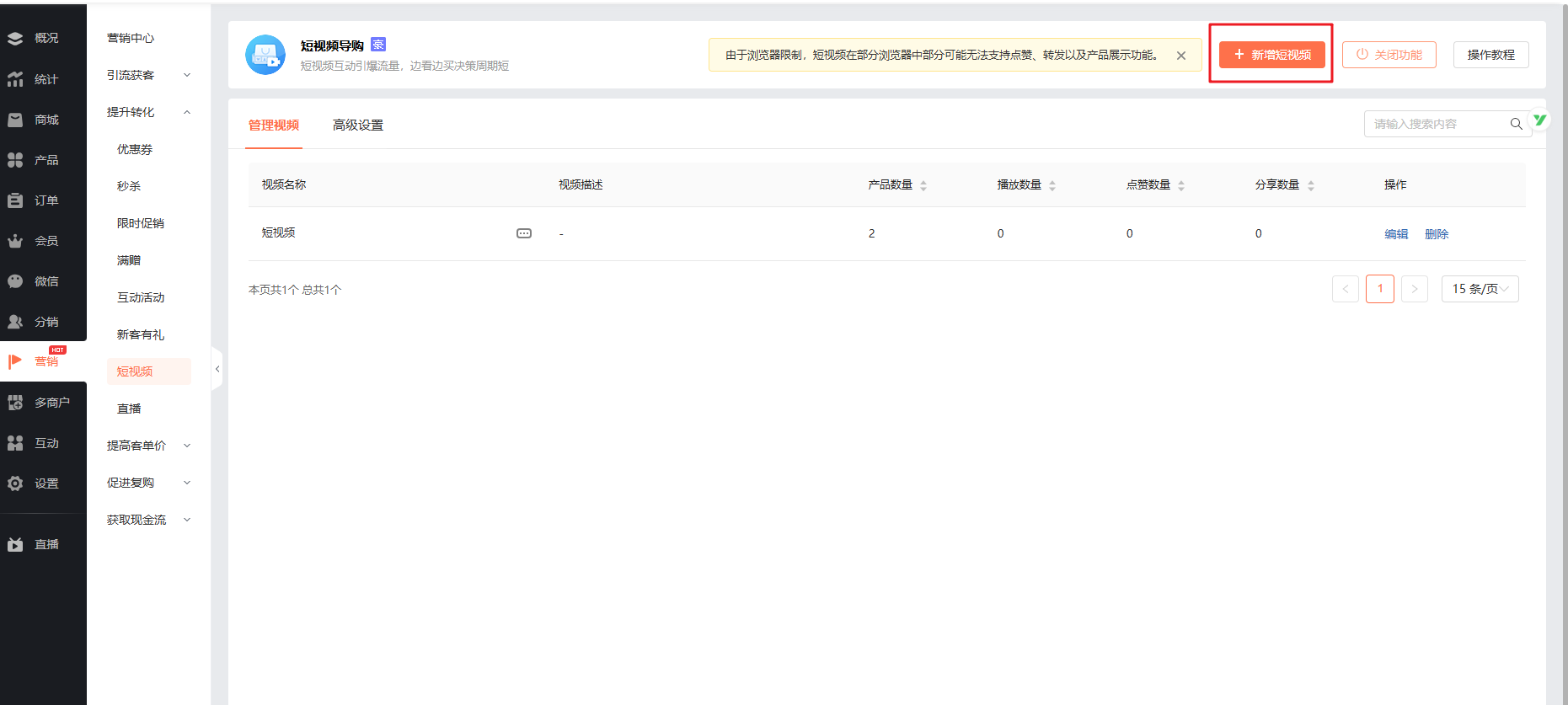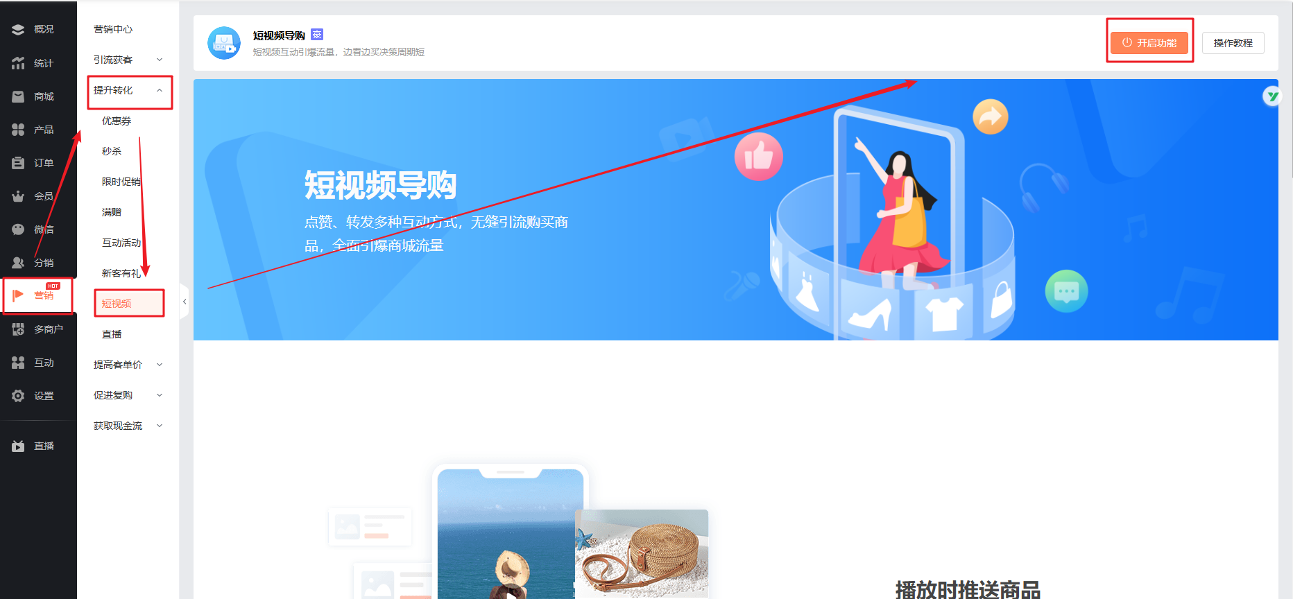 进入【商城管理-营销-提升转化-短视频导购】中,可开启短视频导购功能。