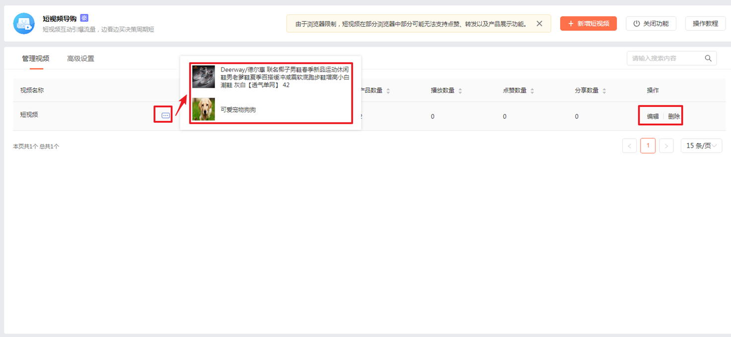 展示所有已添加的视频,支持对视频进行“编辑、删除”操作,同时,也可查看看活动产品的缩略图。