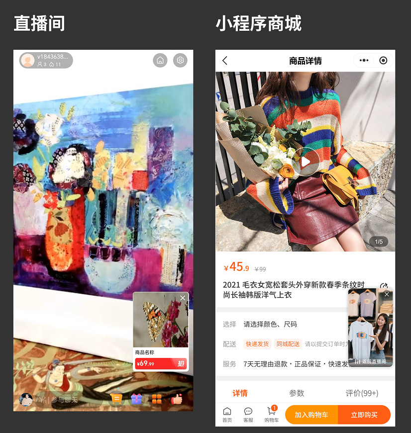 C端访客观看直播时,可点击商品卡片跳转小程序商城进行购物。也支持直接从小程序商城内快捷跳回直播间