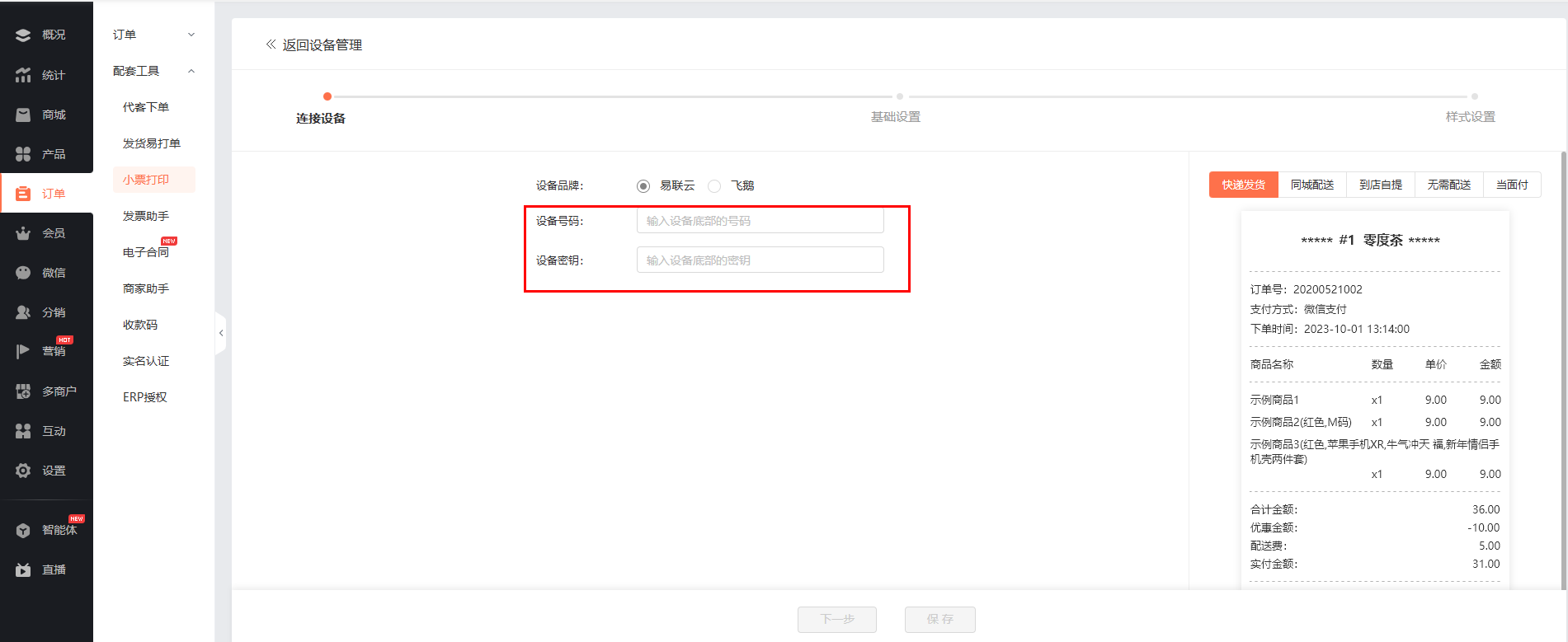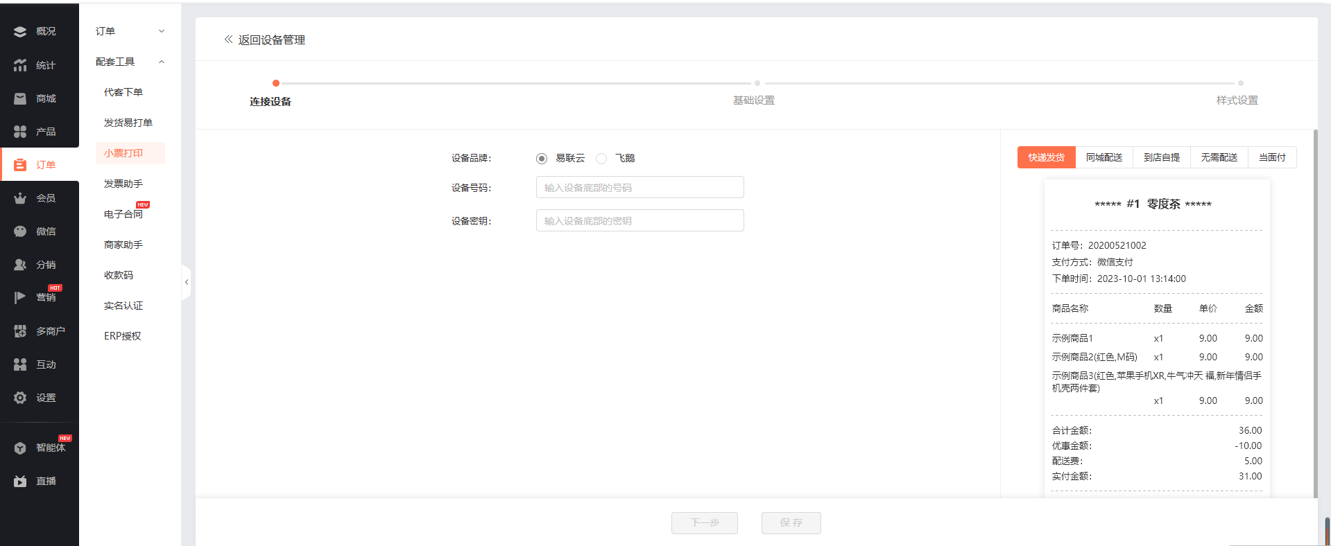 商家可进入【商城管理后台-订单-配套工具-小票打印机】中添加打印机设备。支持”易联云“打印设备,为保障打印机能正常连接,请购买指定品牌及型号的打印机。
