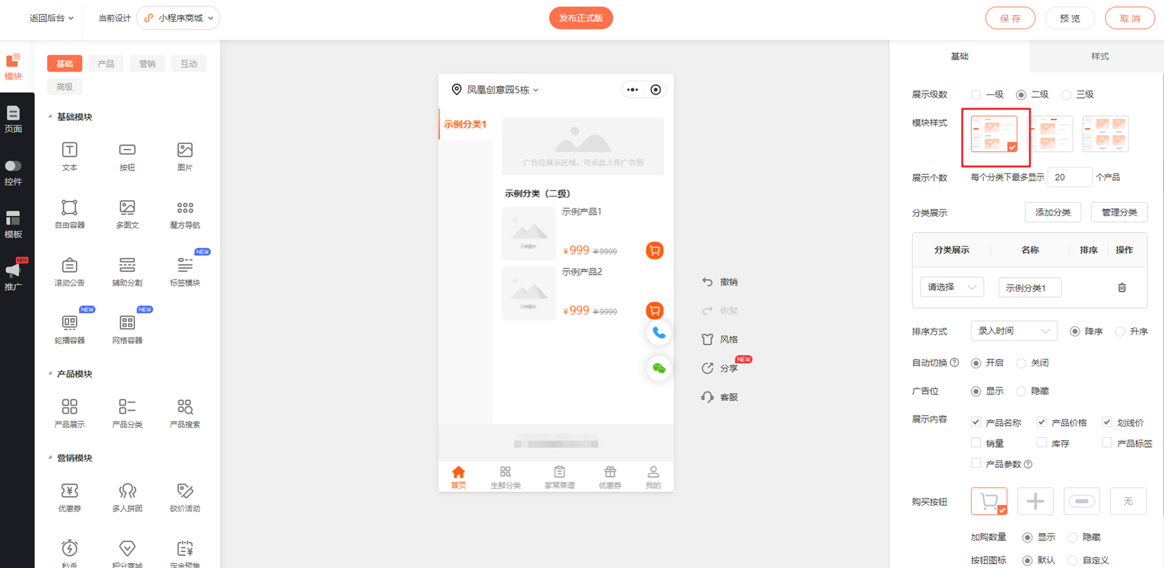 例如:在二级分类展示样式中,仅模块样式一 支持同时显示一级和二级分类的产品,其他样式则存在兼容性限制。