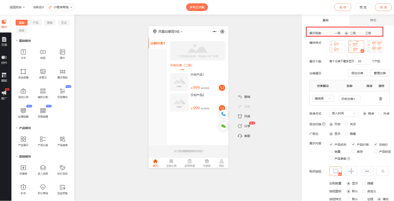 注:若是小程序商城,,则还需要检查「分类展示层级样式」设置是否影响产品显示: 若产品属于一级分类,但当前仅开启二级分类 展示,则产品可能因样式限制无法显示