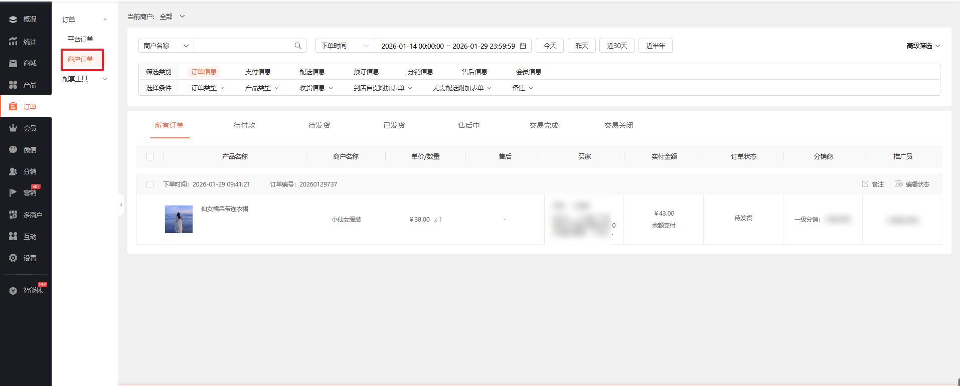 可在「订单--商户订单」中,确认是否同时包含进驻商户与直营商户的订单。