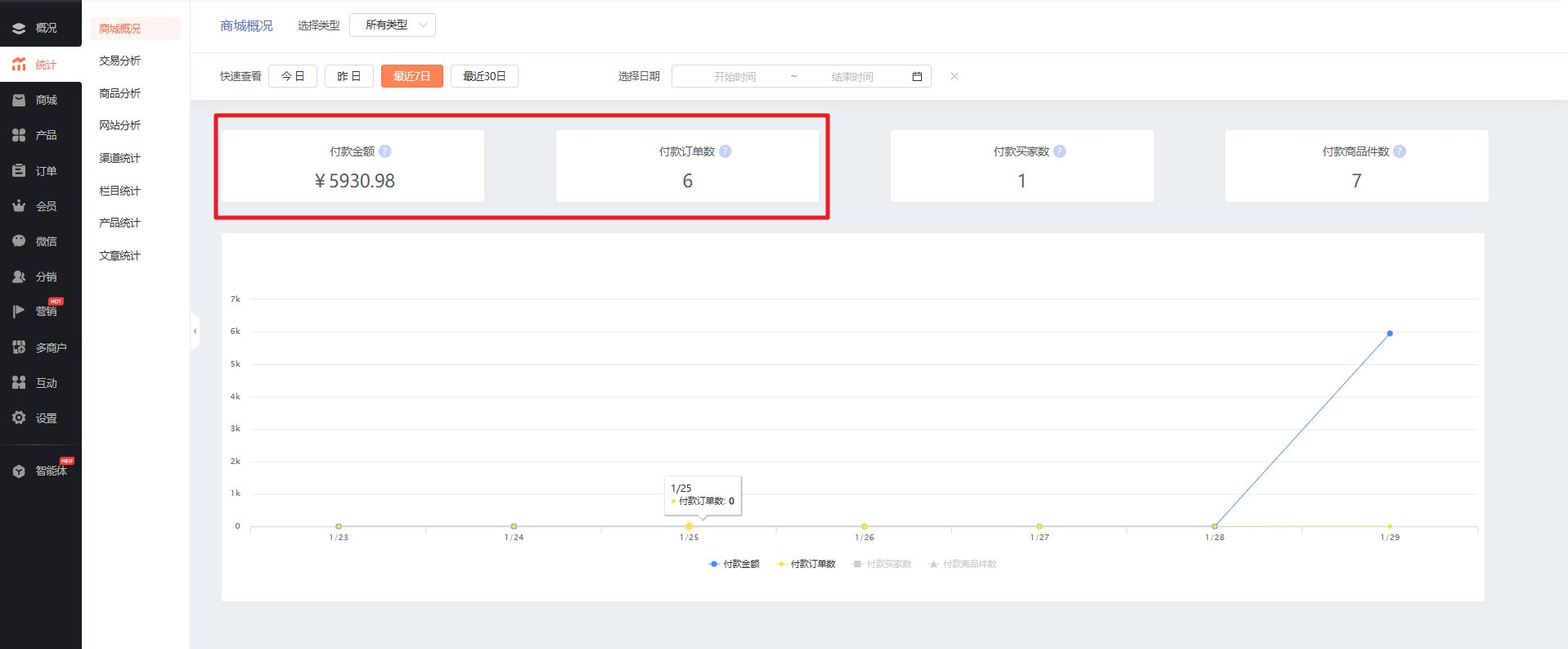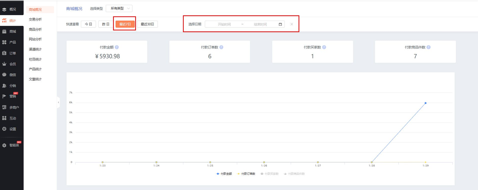 但商城后台统计选的是「近 7 天」,时间范围不匹配,就有可能对不上