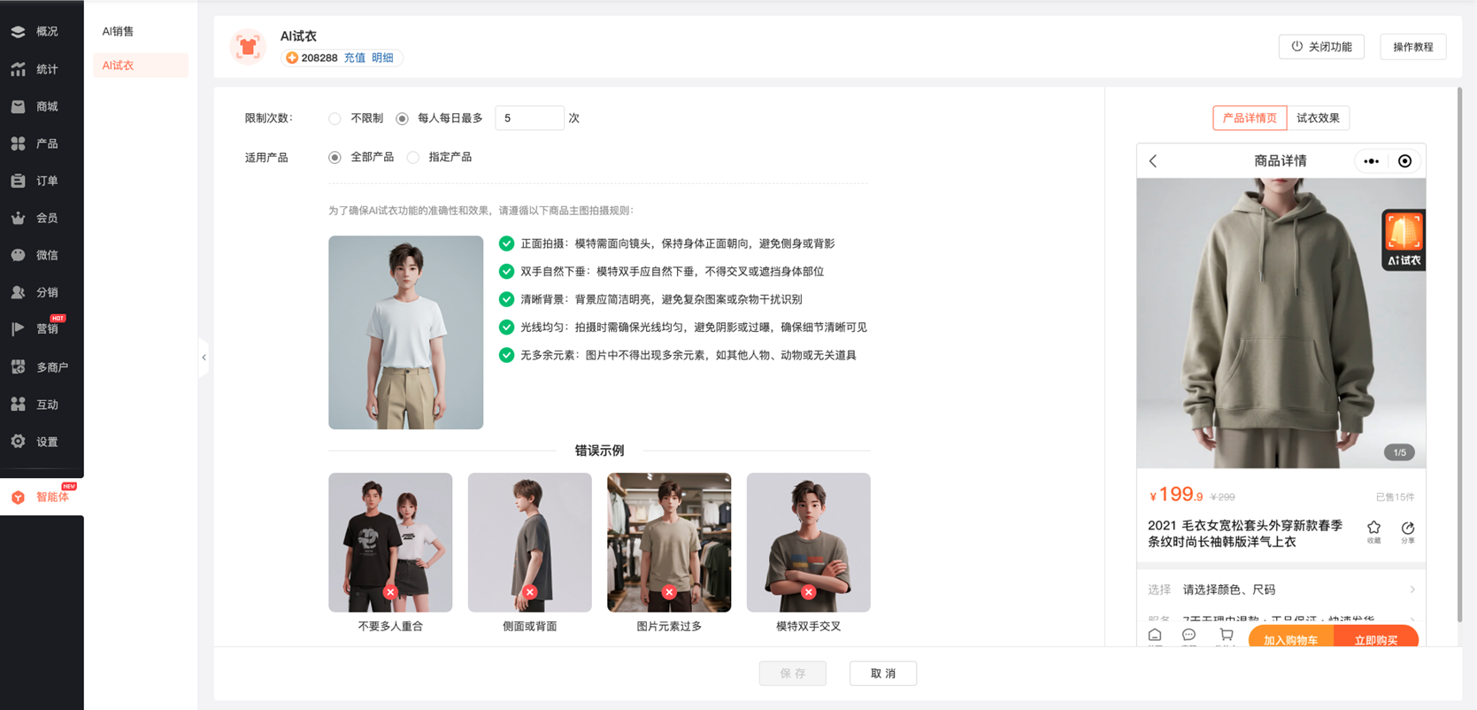 1. 前往商城后台【智能体-AI试衣】开启功能: