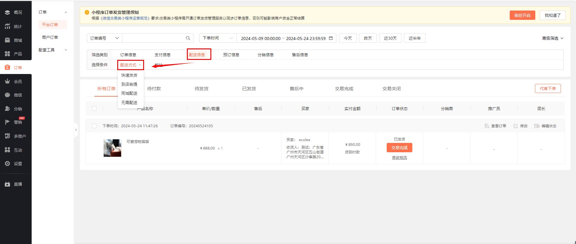自定义后,买家看到的关于“同城配送”的文案将展示为商家自定义后的名称