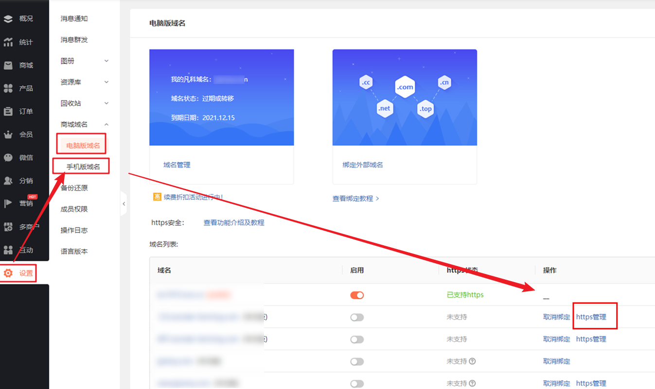一级域名(abc.com):必须绑定并正确指向同一商城才会生效
