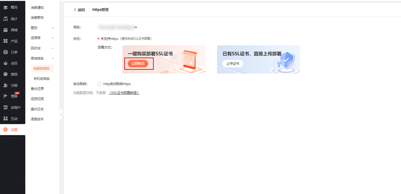 1. 进入商城管理后台,根据需要选择电脑/手机域名进入后,点击立即购买后。