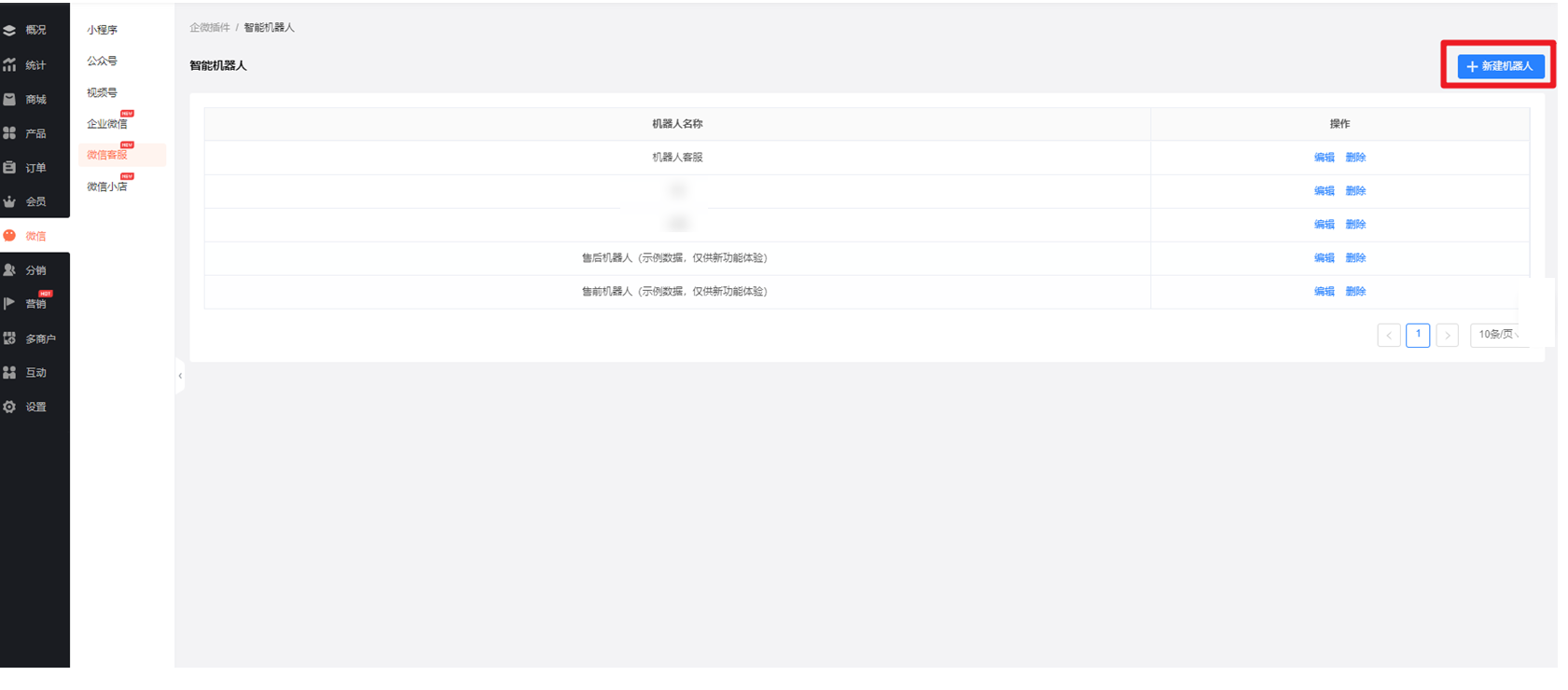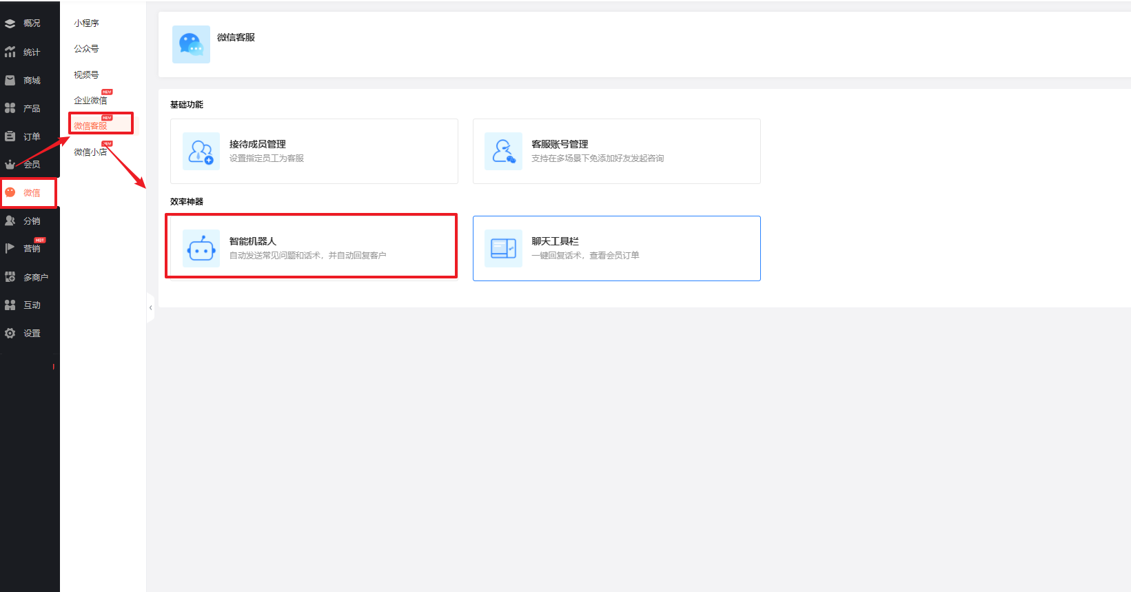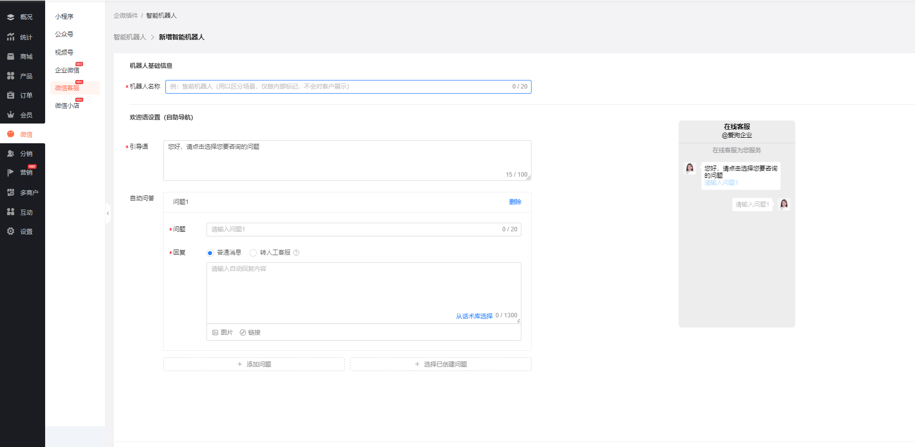前往商城后台【微信-微信客服-智能机器】,新增机器人,设置机器人自动回答规则: