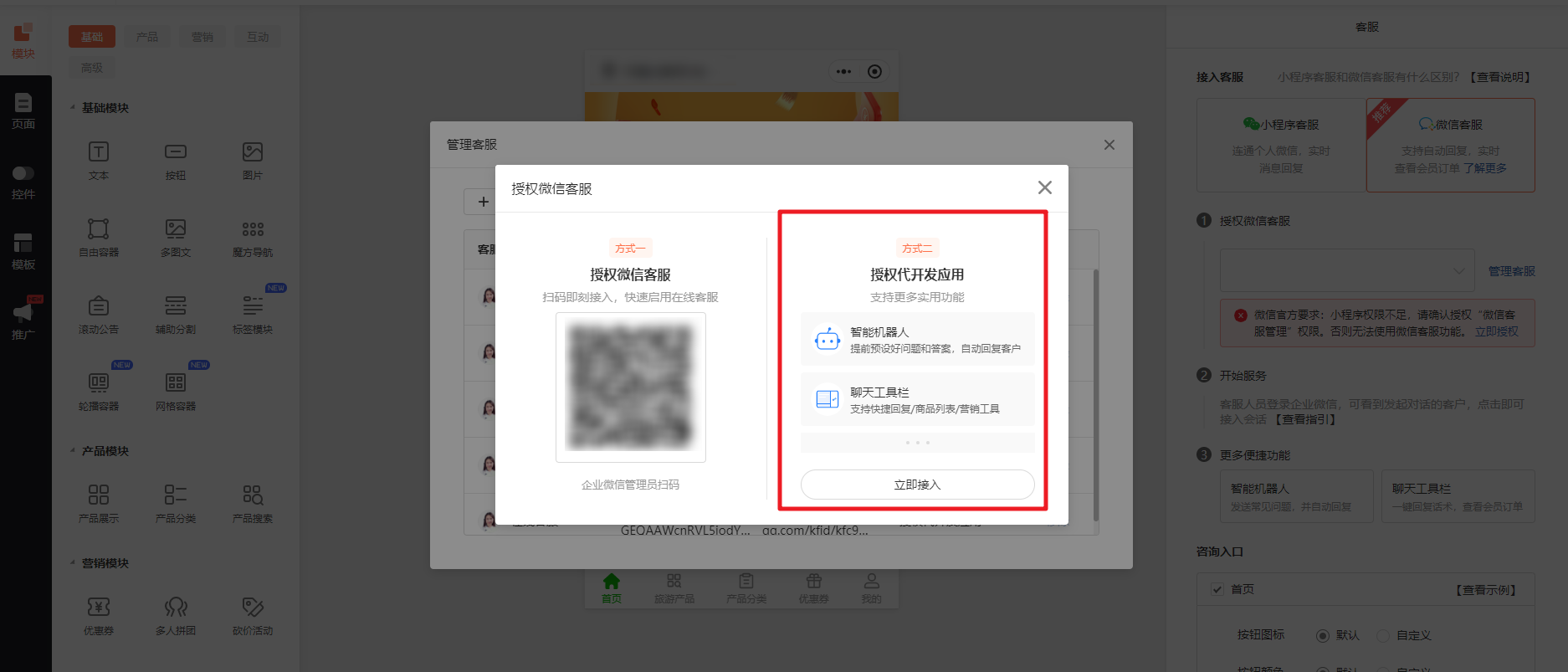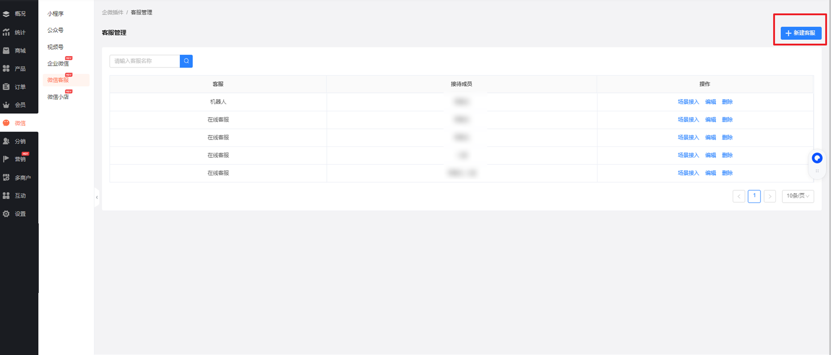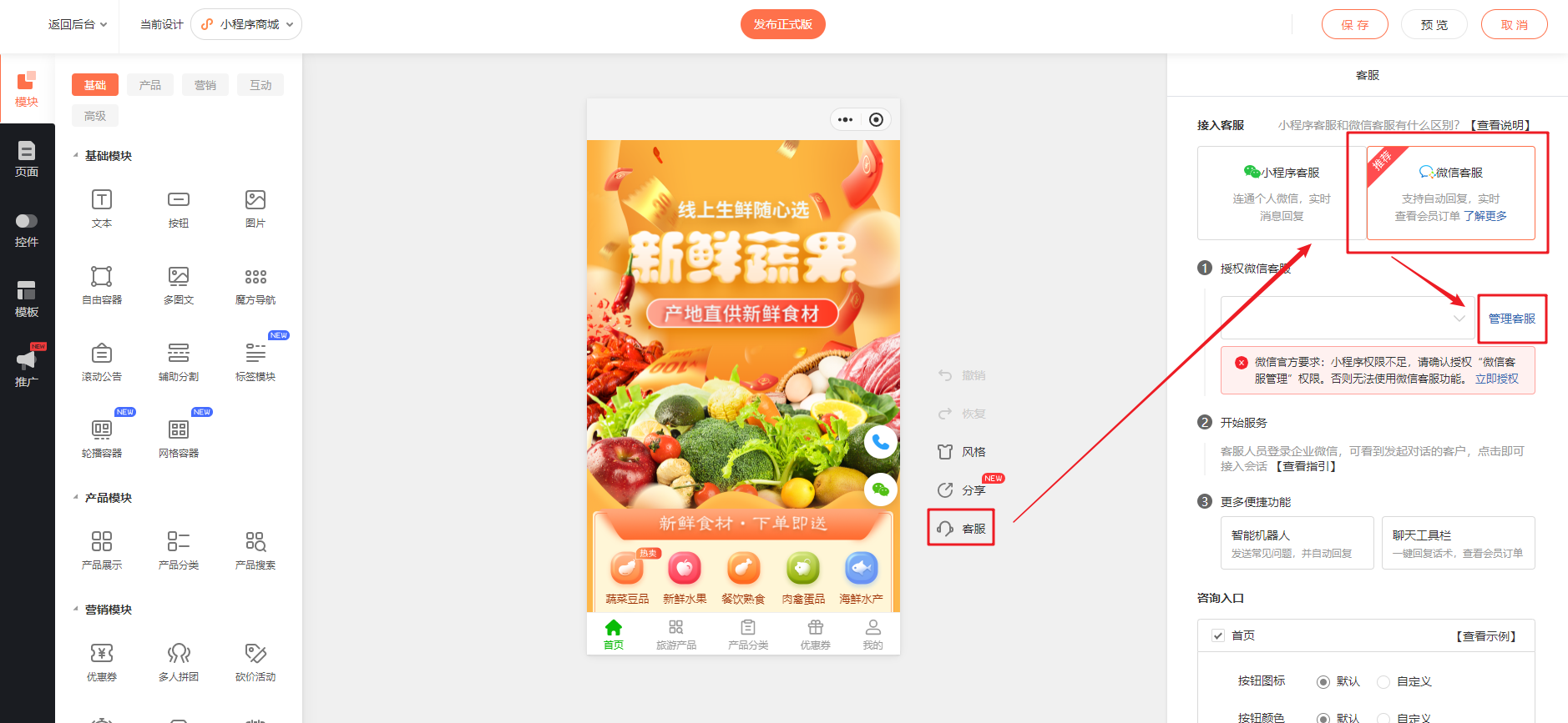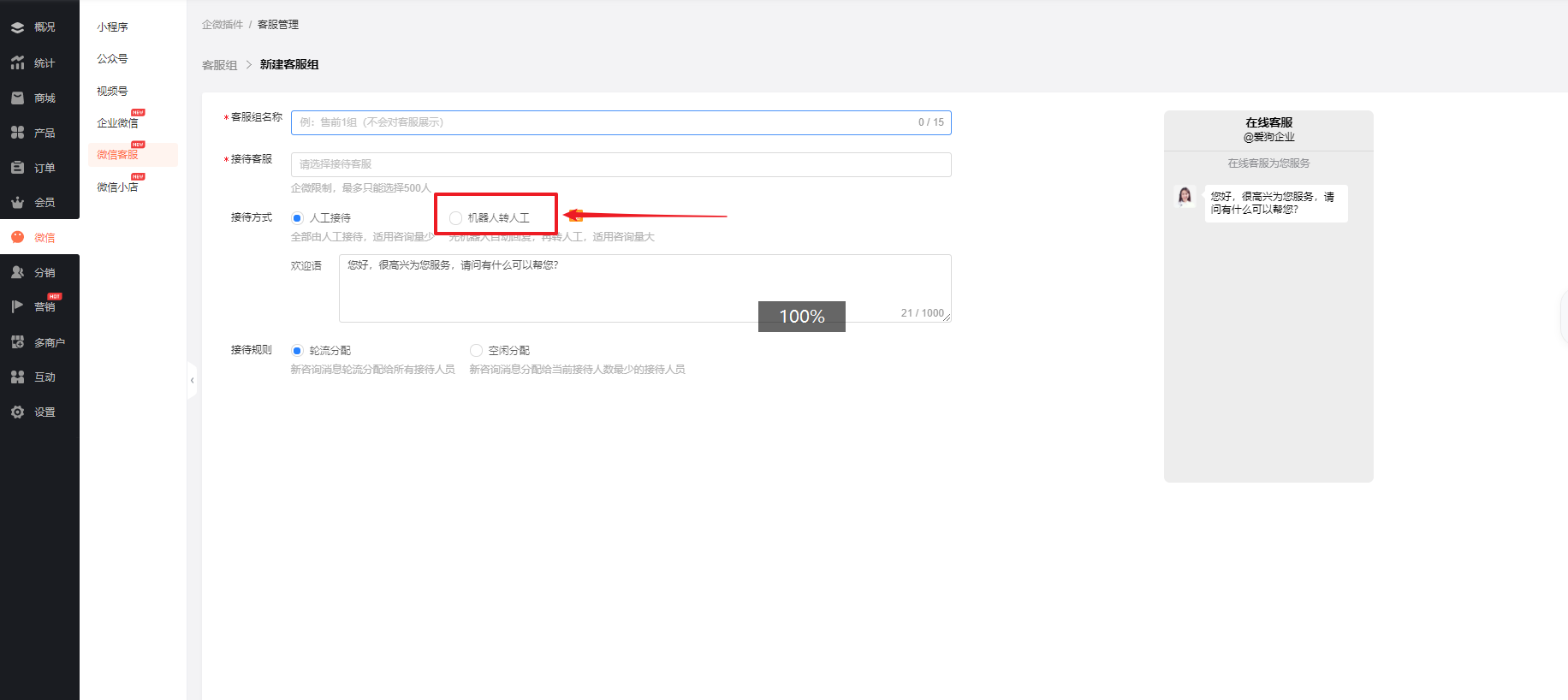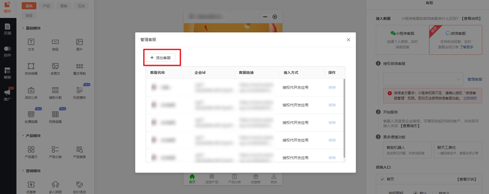 客服组创建完成后,在商城小程序找到客服进行设置