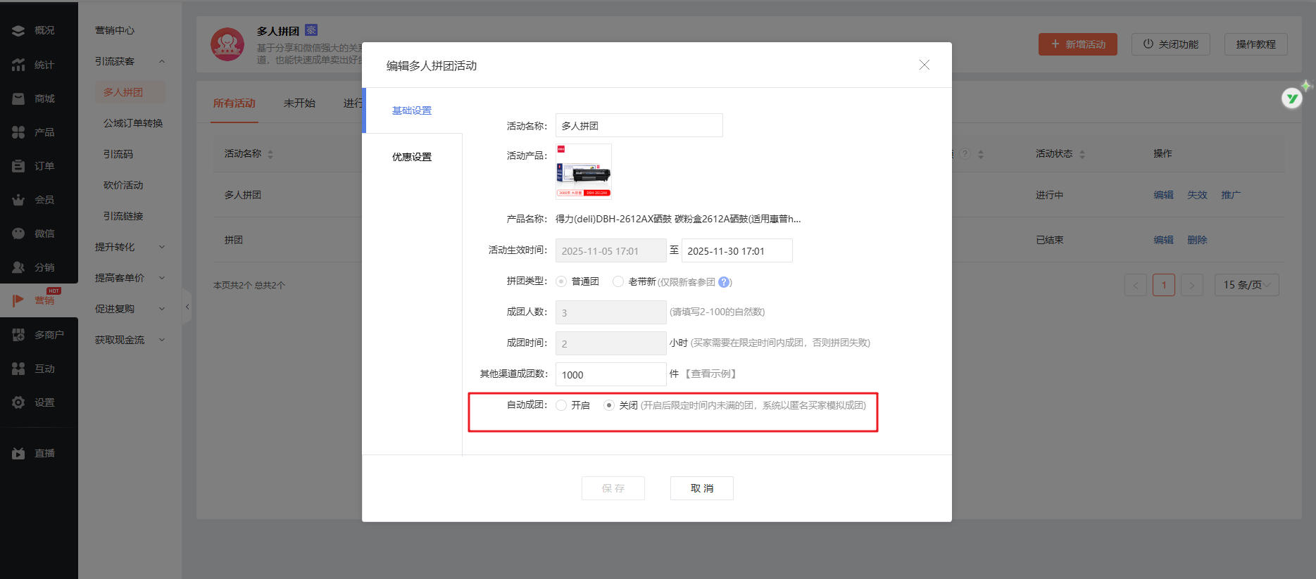 会自动成团的,自动成团是在拼团时间结束的时候去判断是否开启设置的,不会根据用户下单时间判断。
