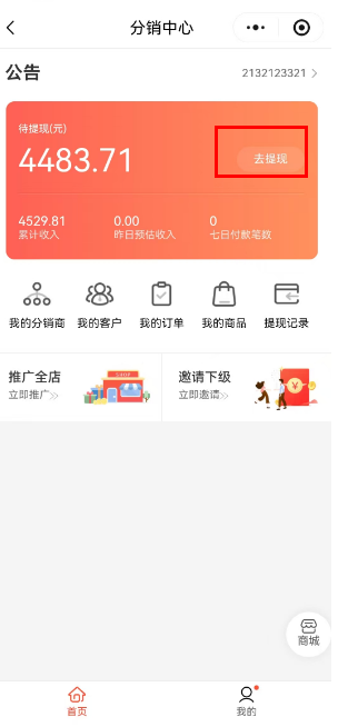 2.商家代提现(备用):分销员无法操作时商家用自己的微信绑定其账号(勿索要密码),手动帮提,审核通过后清零再清退。