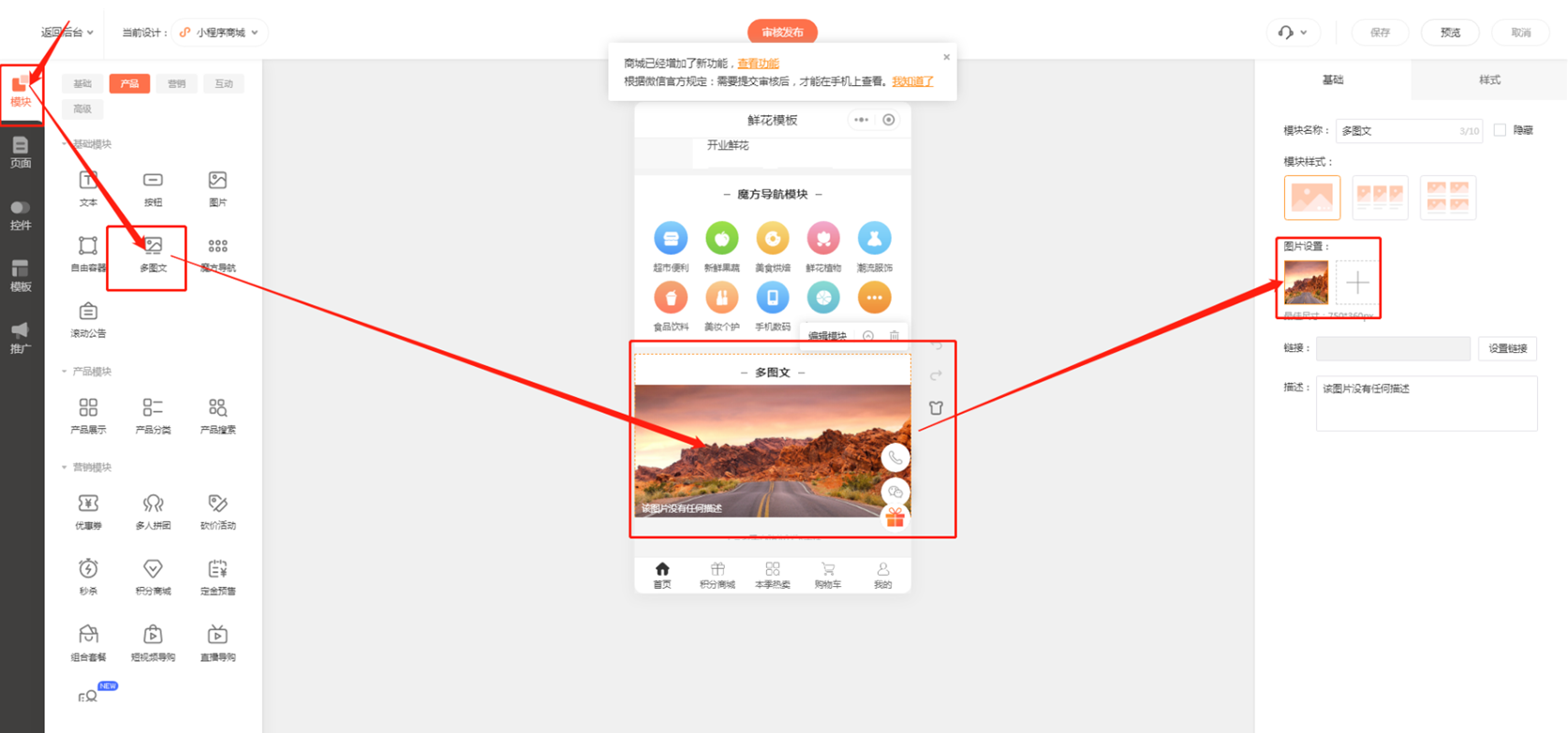 关于商城小程序如何设置横幅,可以添加多图文模块,轮播展示不同的图片哦。