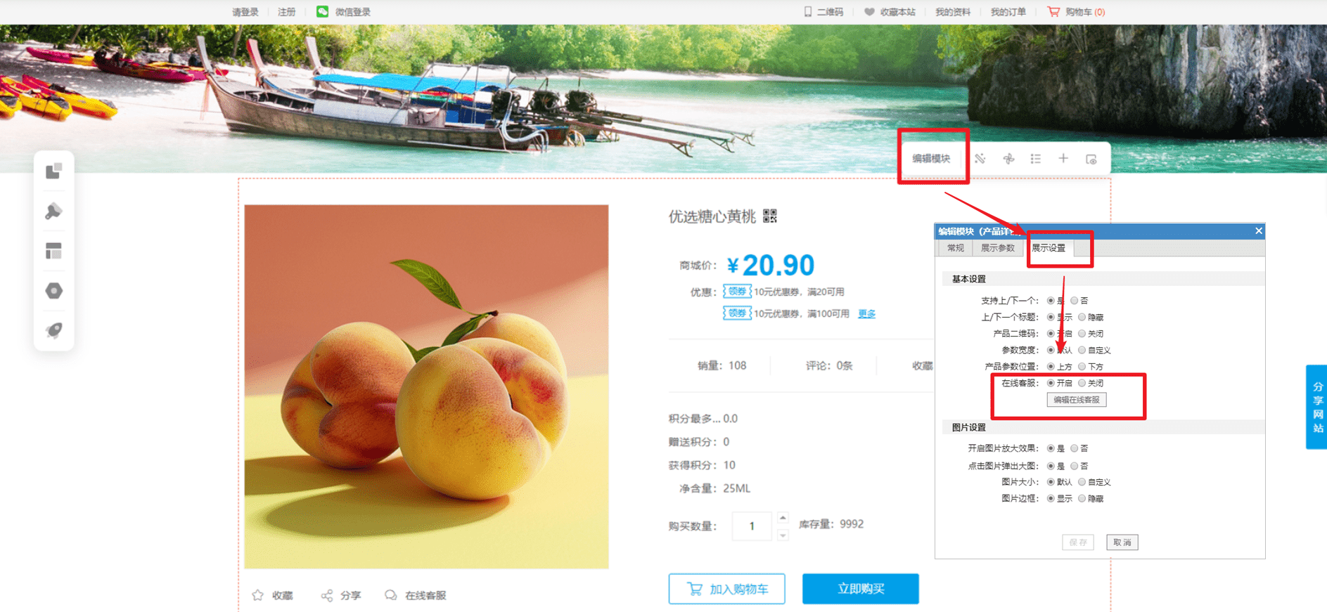1.电脑版:在产品详情中编辑模块--展示设置中添加。