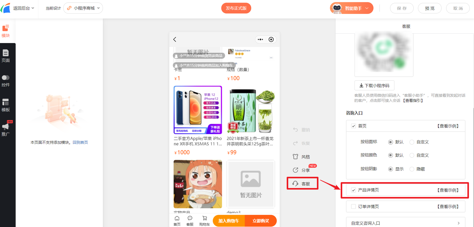 3.小程序:请按此教程完成设置 (点击查看详情),完成后勾选客服场景即可在产品详情中显示。