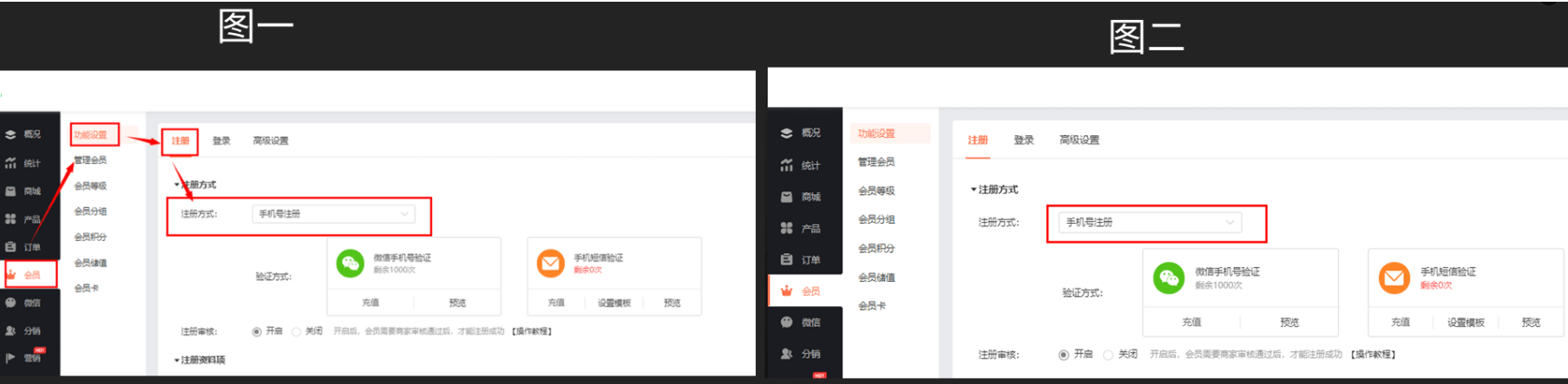 进入网站后台 → 找到【会员-注册设置】→ 将注册方式改为「手机号注册」(支持手机短信验证和微信手机号授权验证)(参考图一示例)。