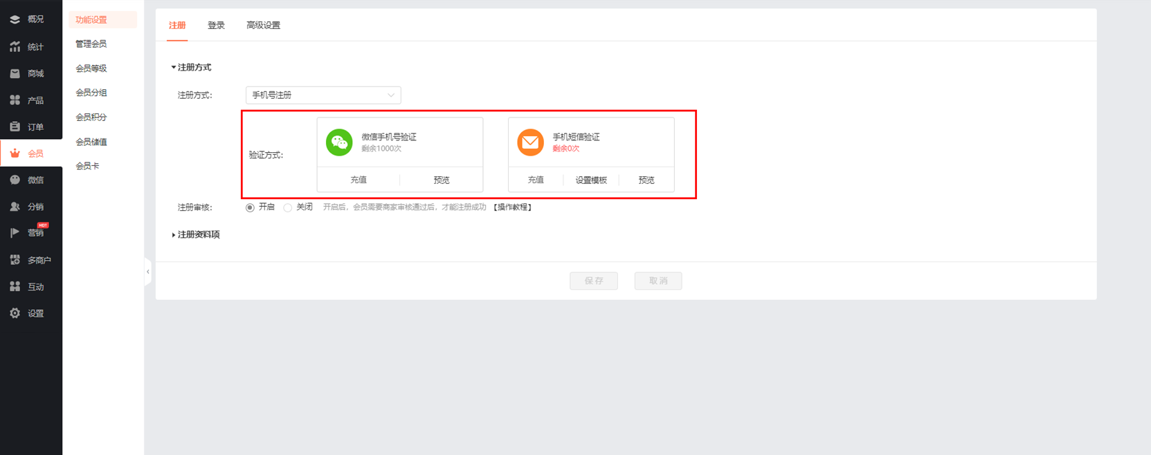 手机短信验证:商家确认已充值并所设置模板已通过审核,才确保能发验证码到用户手机。