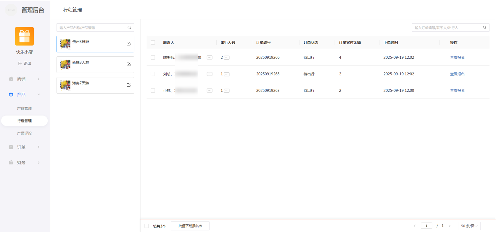 3.在商城后台,总店同步可查看子商户的旅游产品订单和行程管理