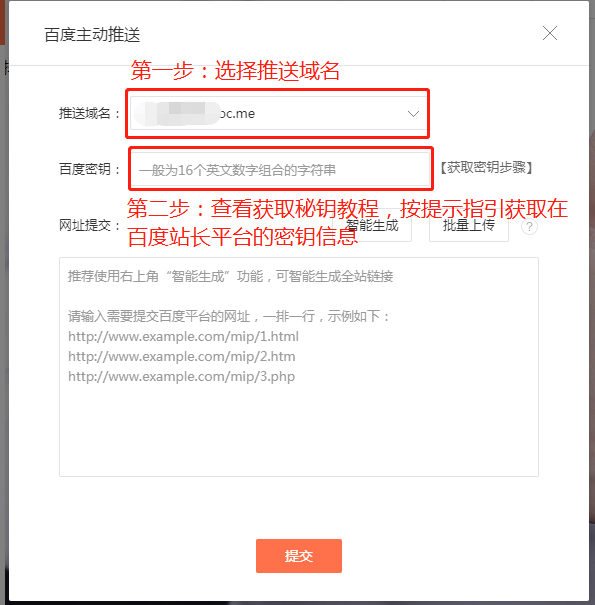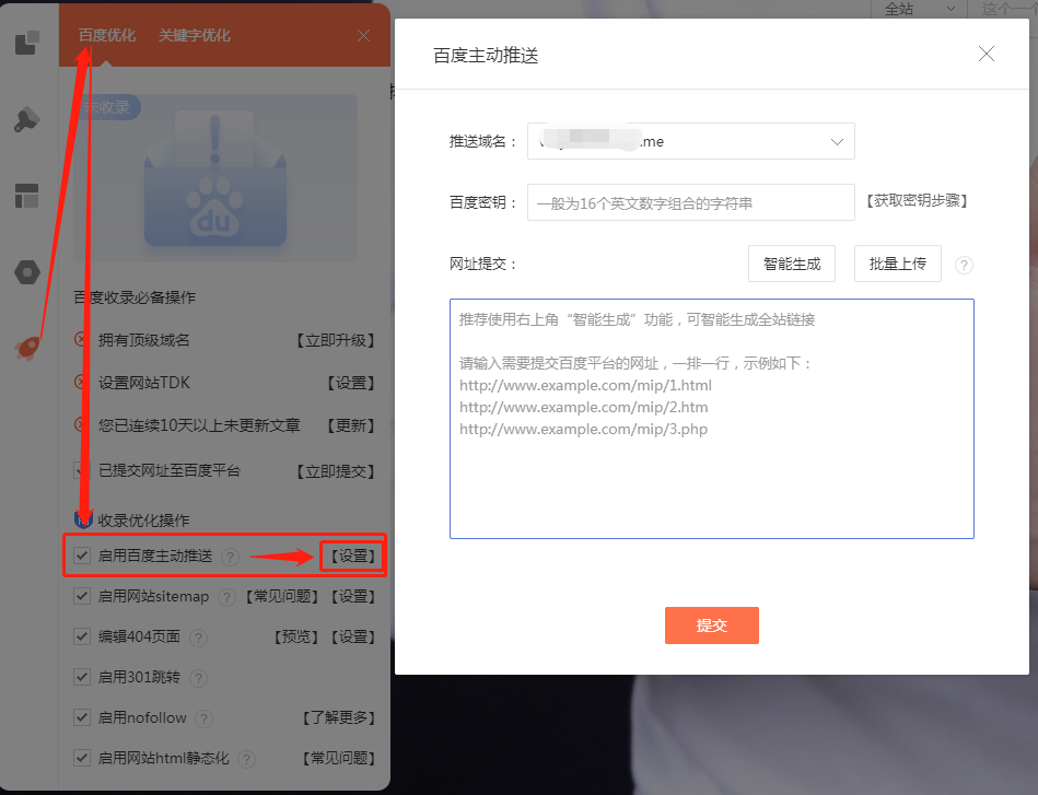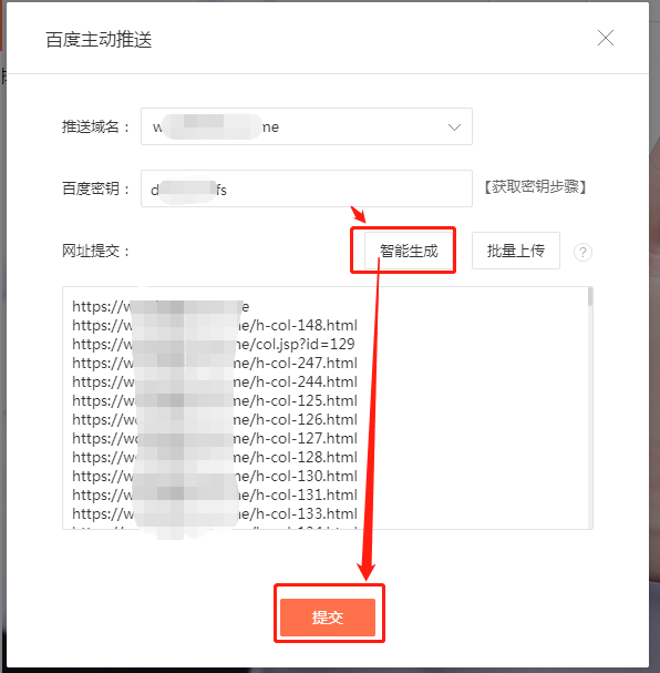 三、按照教程指引生成密钥后,将密钥填写至【百度密钥】处,点击智能生成,最后进行提交即可。