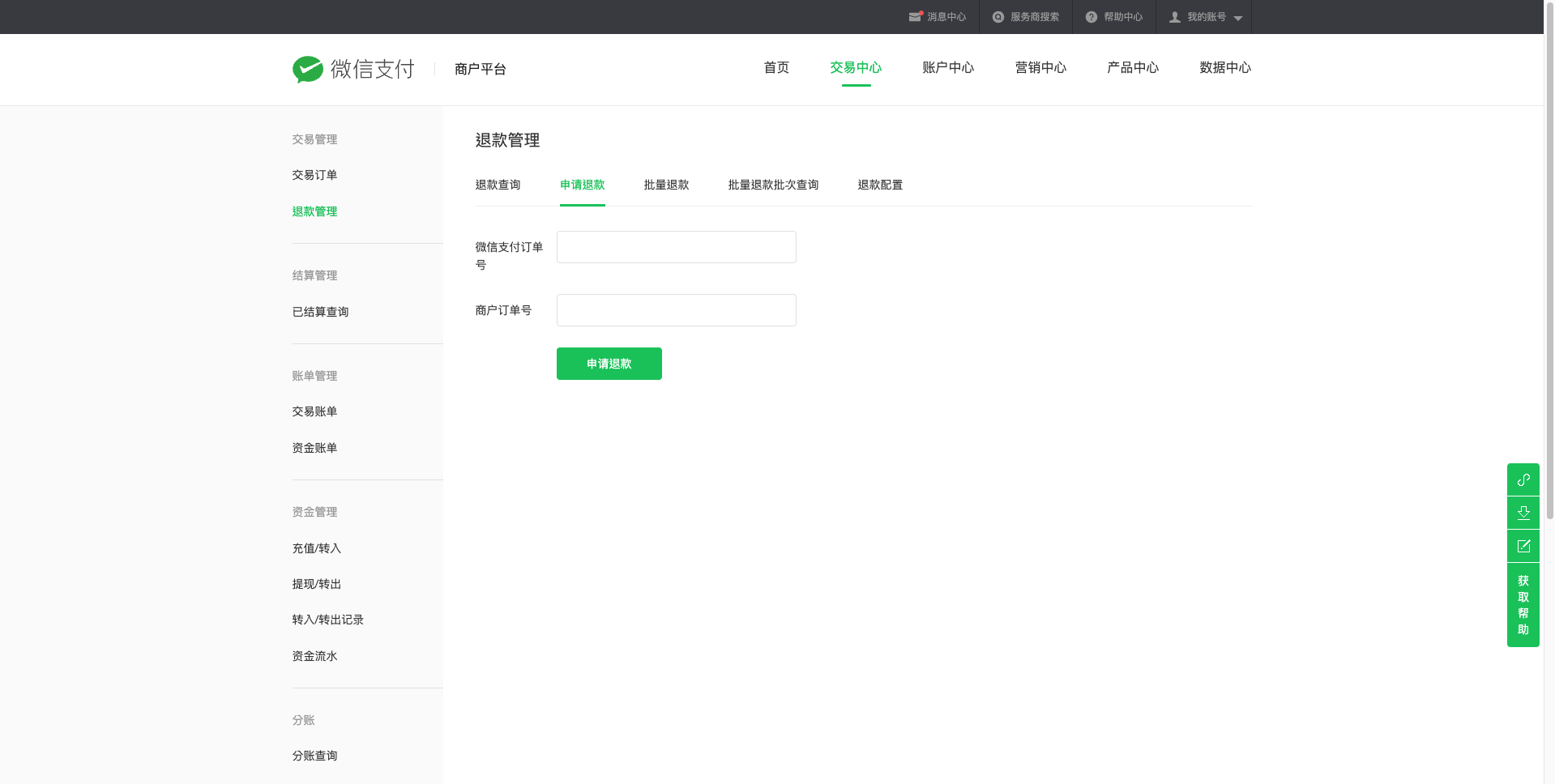 充值完成后,前往 微信商户平台-退款管理力(路径:交易中心>退款管理 >申请退款),选择需要退款的订单,提交原路退款申请。
