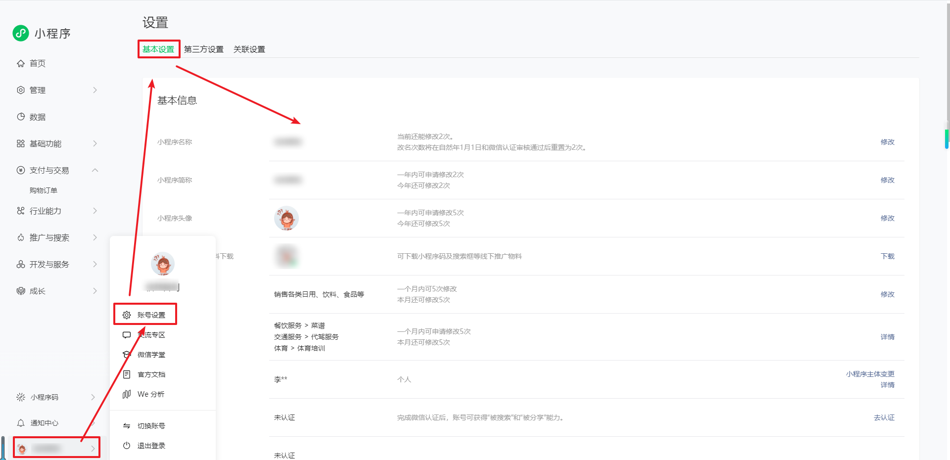 (需使用小程序对应的邮箱账号登录),进入【设置】-【基本设置】可进行修改小程序名称、简称、头像、介绍等信息。