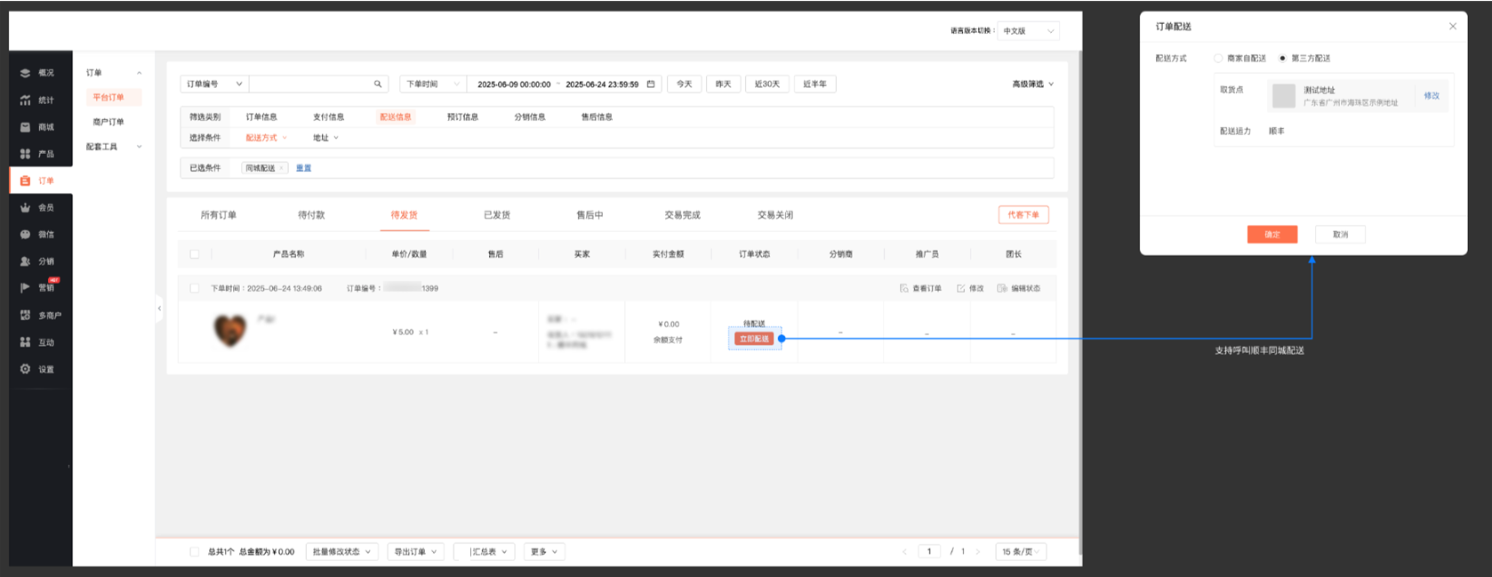 2. 前往商城后台【订单-订单管理】,对同城配送订单可呼叫第三方配送(顺丰同城配送):