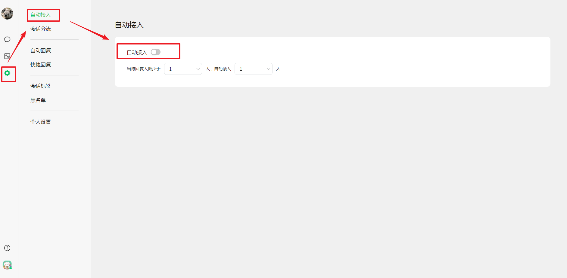 客服在线的情况下,在“设置”中选择自动接入,如不开启自动接入,即为手动接入