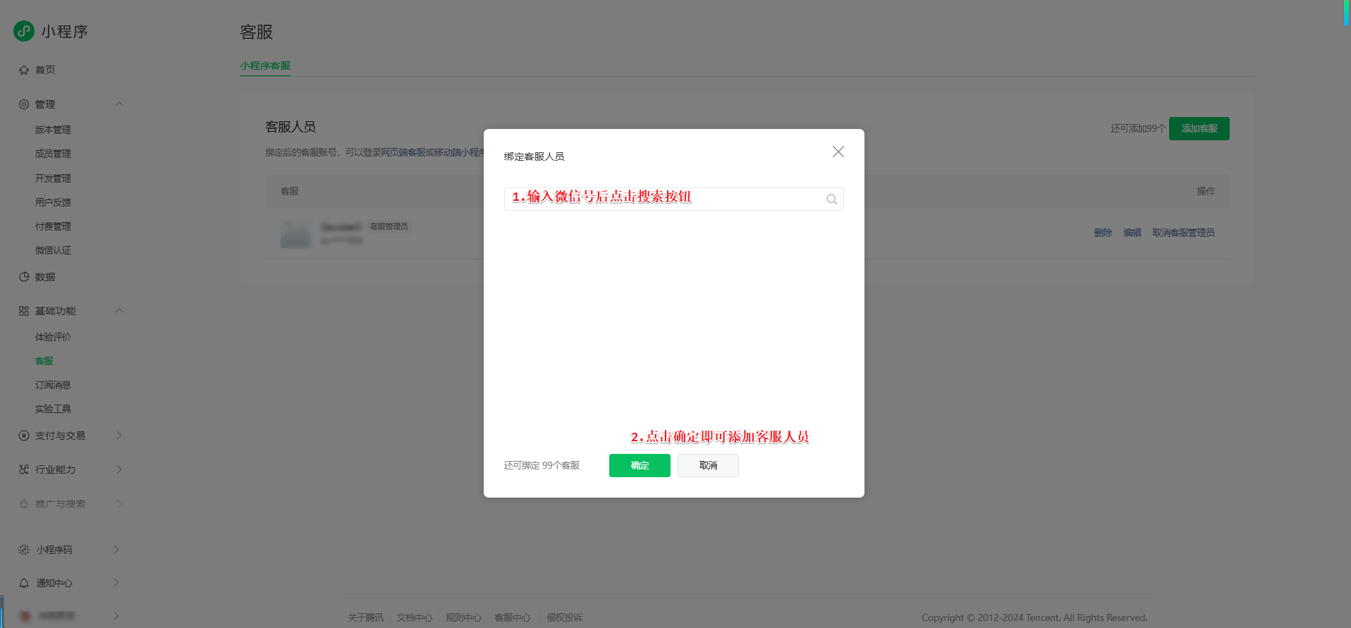 ② 在绑定弹窗中输入要绑定的客服微信号进行绑定。(目前小程序支持绑定不多于100个客服人员)