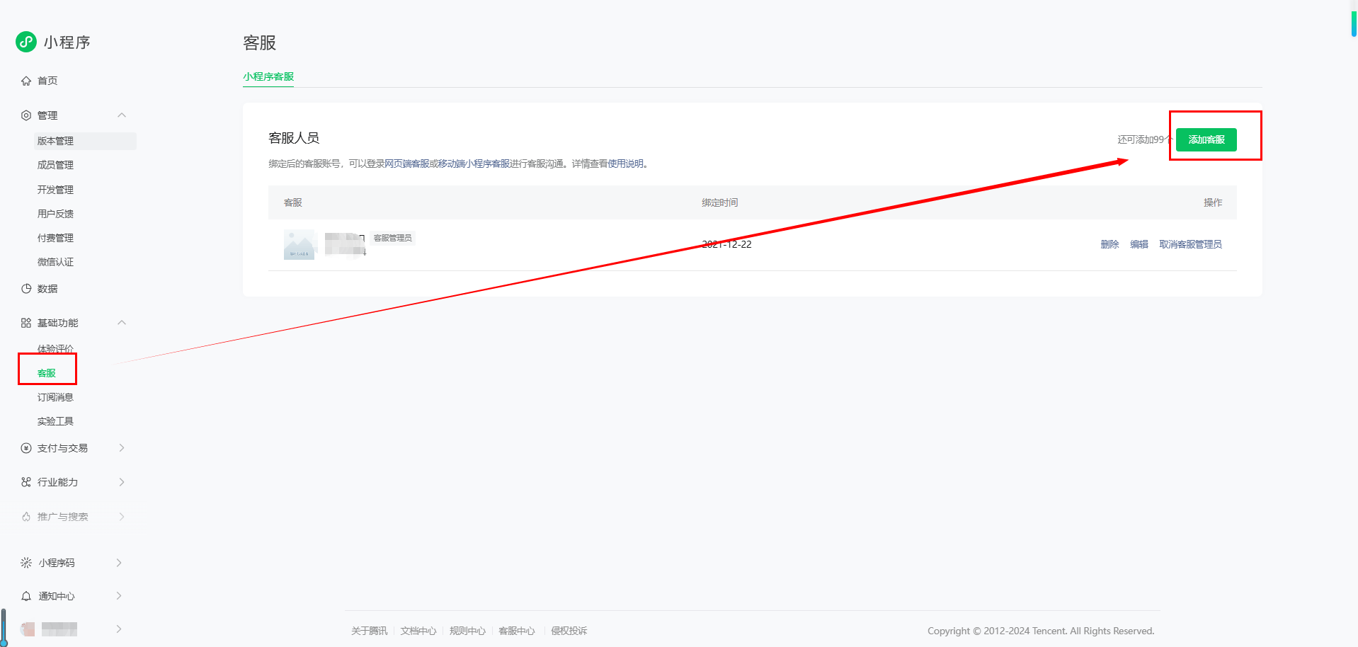 ① 在微信公众平台登录授权给商城的微信小程序账号,在【客服】中点击“添加”按钮。