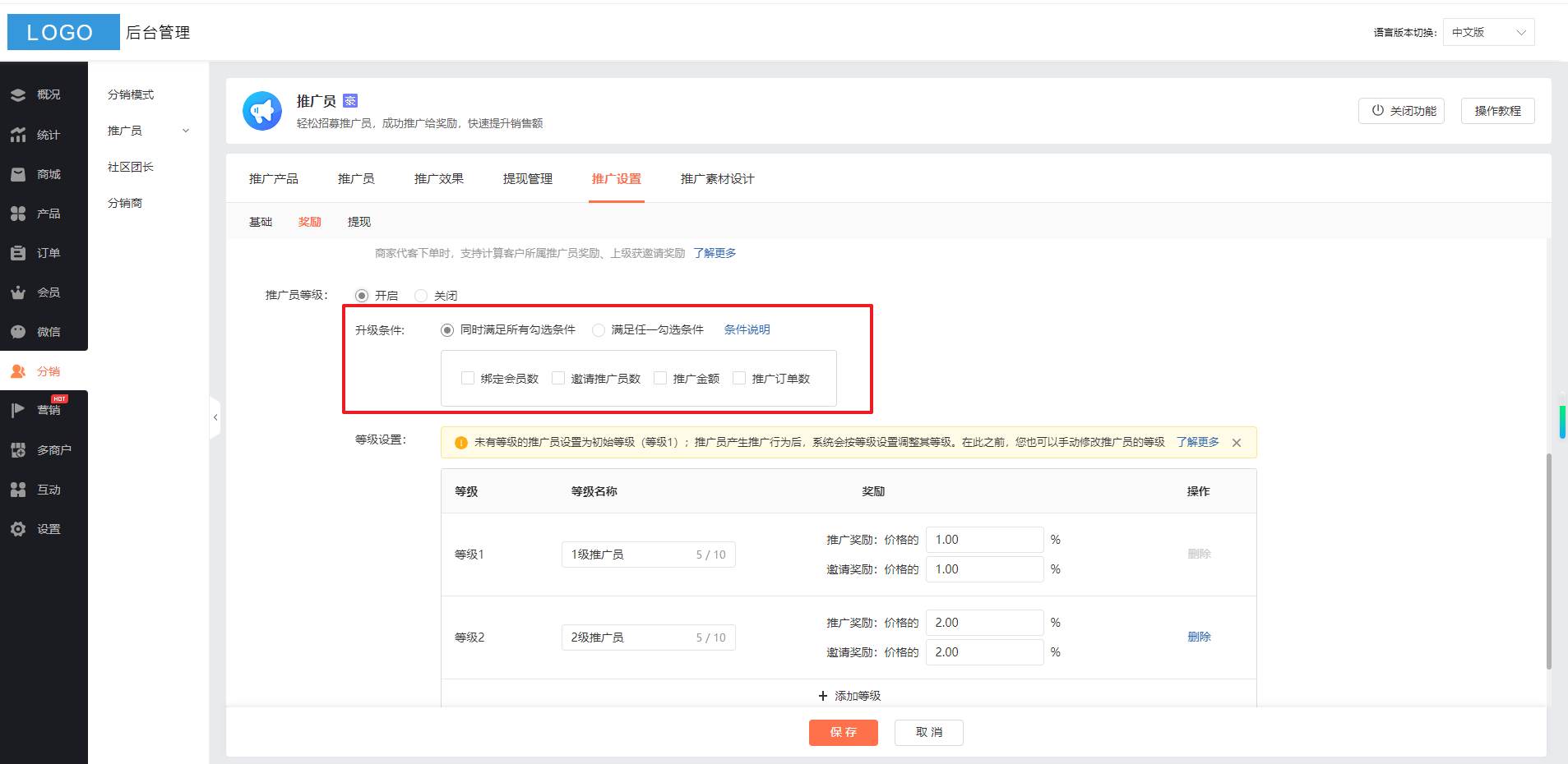 PS:若在商城开启等级前加入为推广员,商城开启等级后,此前的推广员即判定为【未有等级】。