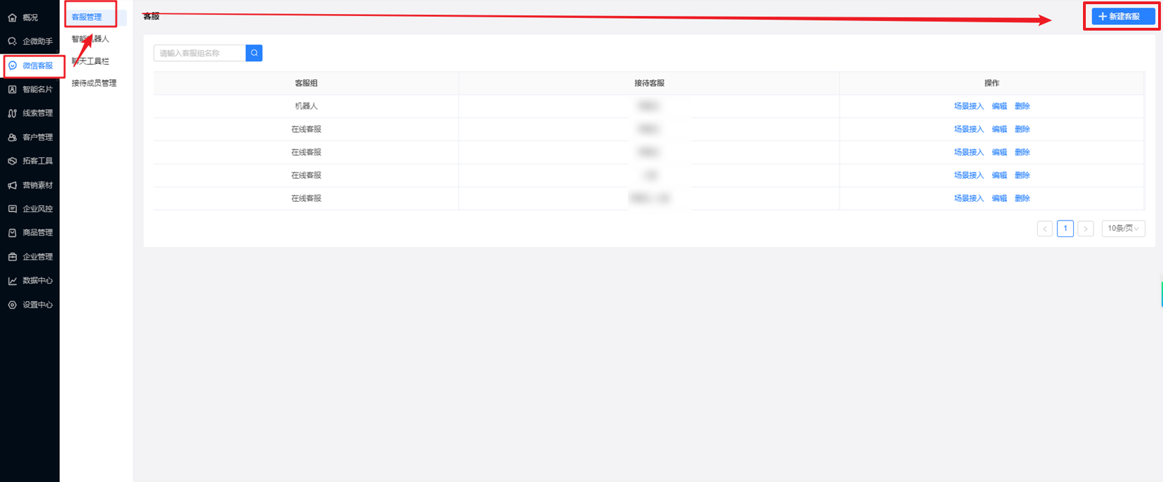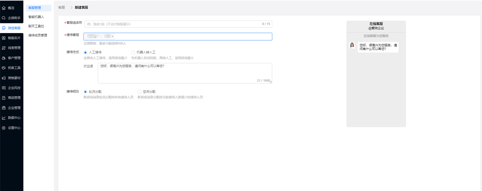 然后点击客服管理,从【客服列表】,设置对应客服规则,并选择部分成员(可选择1或多个成员)),加入到【客服】即可