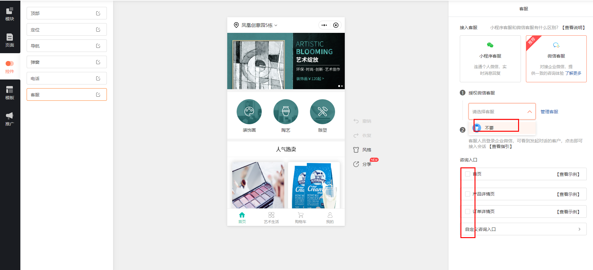 ③ 销售系统后台的客服账号会同步至商城设计器选择客服列表中。(注:需要企微主体与微信小程序一致才可正常使用)