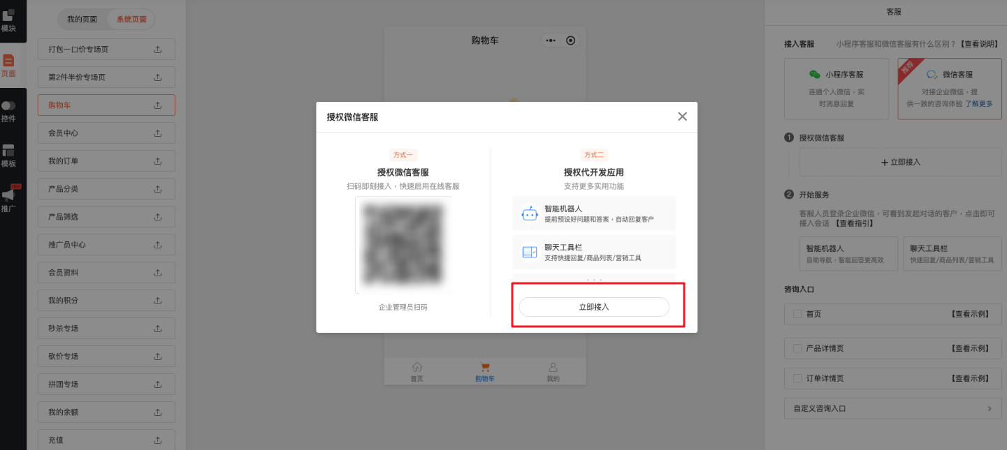 支持直接获取销售系统后台设置的微信客服账号,用于商城客服接待,使用前需要先接入企微设置(点击查看: 接入教程)