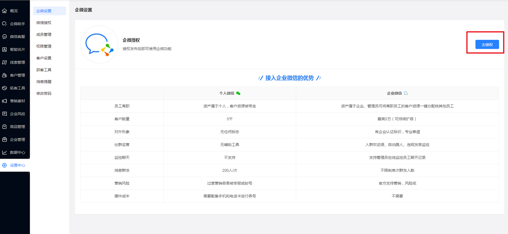 ① 点击【立即接入】前往销售系统先进行企微授权